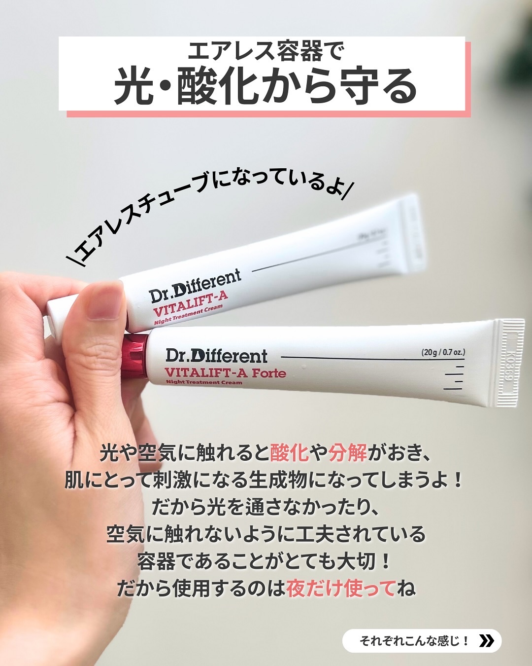 \レチナール美容を始めたい人、注目/ レチナールとはレチノイドの一種で、肌のターンオーバーを促進し、シミ、シワやたるみの改善に効果が期待される成分です。 そこでおすすめしたいのが、ドクターディファレントのビタリフト-Aシリーズです。スリムなチューブ容器はエアレスタイプで、最後までレチナールの劣化を防いでくれるんだそう。 レチナールは光と紫外線に弱いので、夜のスキンケアに使ってくださいね。