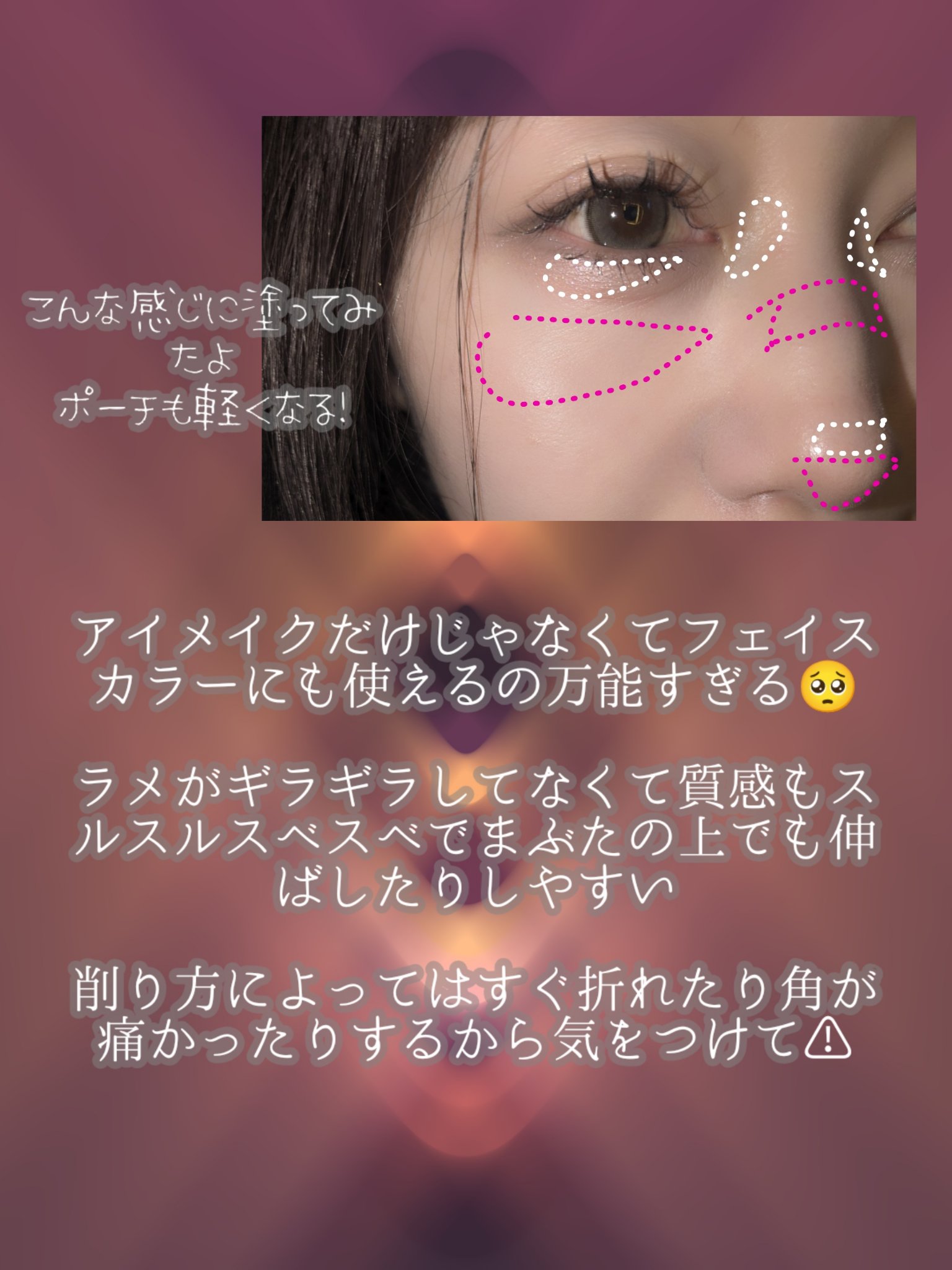 ちゅるっと見せが今のおすすめかな? ちゅるっとさせるには細いブラシがおすすめ❤ あーメイクって詐欺れるから楽しい。 盛れなかった日ももちろんあるけど盛れると1日楽しくなれる。 ハイライト、チーク、シェード、一体どこに何を入れれば盛れるの?!!って迷走中の皆さんに。