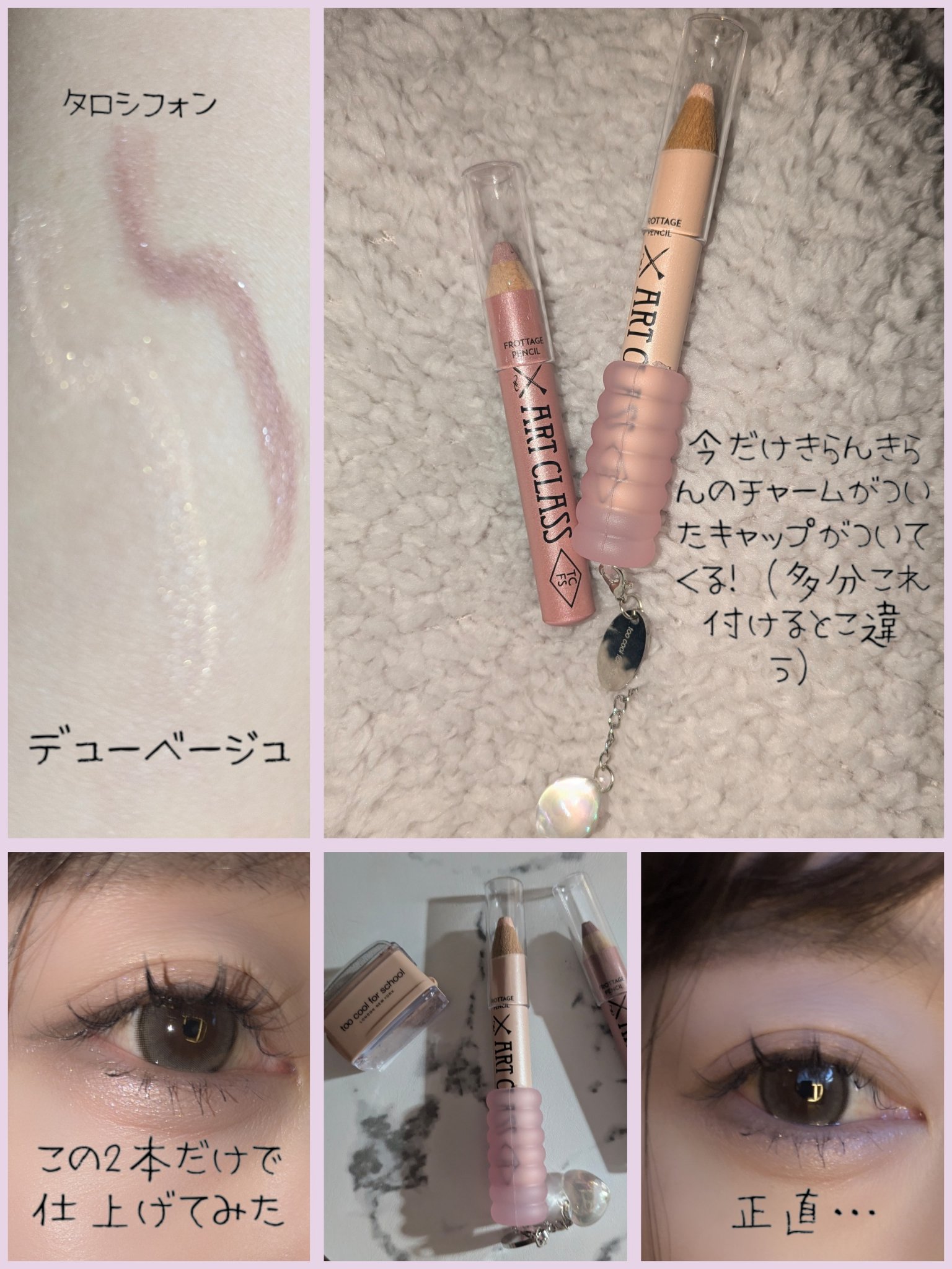 韓国アイドルの暗めの涙袋のやり方を、これを買ってから理解した。 フロタージュペンシルは、太めで、軽い力で涙袋に乗るペンシルで、さらっと暗めの涙袋になれる。 #17タロシフォンは、暗めのピンクベージュで、イエベ秋とブルベ冬みたいな陰みたいな色。少し銀のパール入ってるけど、意味をなしているのかはわからない。 シマーで、ぼかさなくても肌に溶け込むような柔らかい色で、暗め涙袋にぴったり。 肌が黒い人におすすめ!