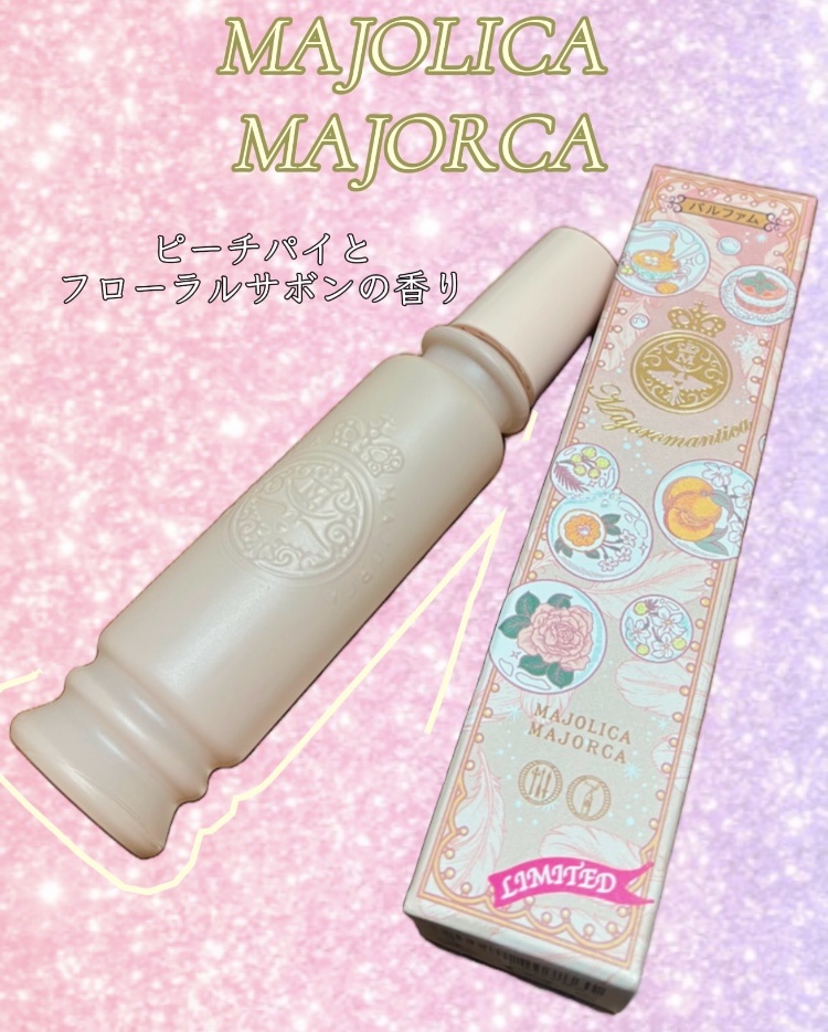 マジョリカマジョルカがファンの皆さんと一緒に作り上げた特別な限定マジョロマンティカ🍑 ピーチパイとフローラルサボンの香りで最初はピーチの香りが強めにでます 2,000円以下とプチプラ価格なのにしっかり香りもする上に持ちもいいので好印象です✨ ガラス製でおとぎ話のようにファンシーな容器デザイン 中に入っているスパチュラまでデザインが凝られていてかわいい💓