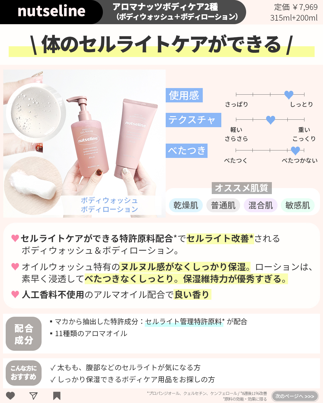 最近ダイエット中で1ヶ月半で7.5キロ落としたけど、筋トレも頑張ったのに、太ももに凸凹とセルライトが目立つようになって心配…。 一週間ぐらい使ってとても満足。オイルウォッシュ特有のヌルヌル感が一切なく、ボディローションも素早く浸透してべたつきもなく、しっとり。 🩷セルライトケアができる特許原料配合でセルライト改善*2