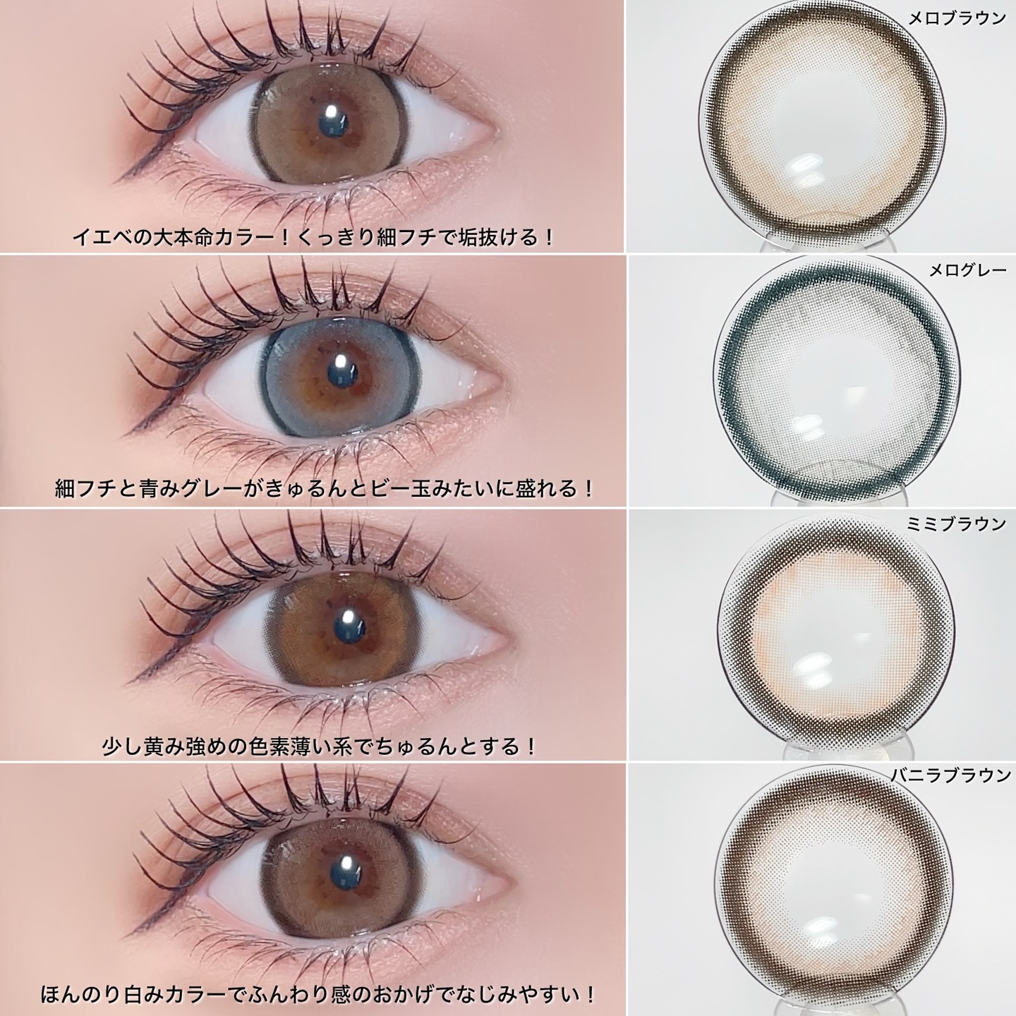 キャンマジで人気の4色がもっと盛れるサイズになったよ- ふんわり太フチであまーく盛れる🧸♡₊⁺ 明るめブラウンがフチとのコントラストでハッキリ盛れるよ🫶🏻´- 発色の綺麗なグレーです( ॑˘ ॑* )