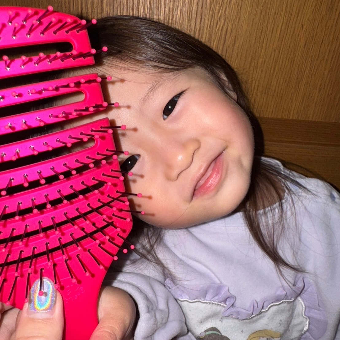 速乾ブラシでストレスフリーなツヤ髪へ プロ フレックスドライ パドル ピンク使ってみたよー❤️ 頭にフィットするしよく曲がるの!それにピンが柔らかくて濡れた髪でも絡まりにくく、とかすだけでトリートメント後のようなツヤサラな髪になっちゃう🙌 大きめのブラシだから髪をいっぺんにとかすことが出るよー!娘も気に入ってるし私もお気に入り🤭❤️