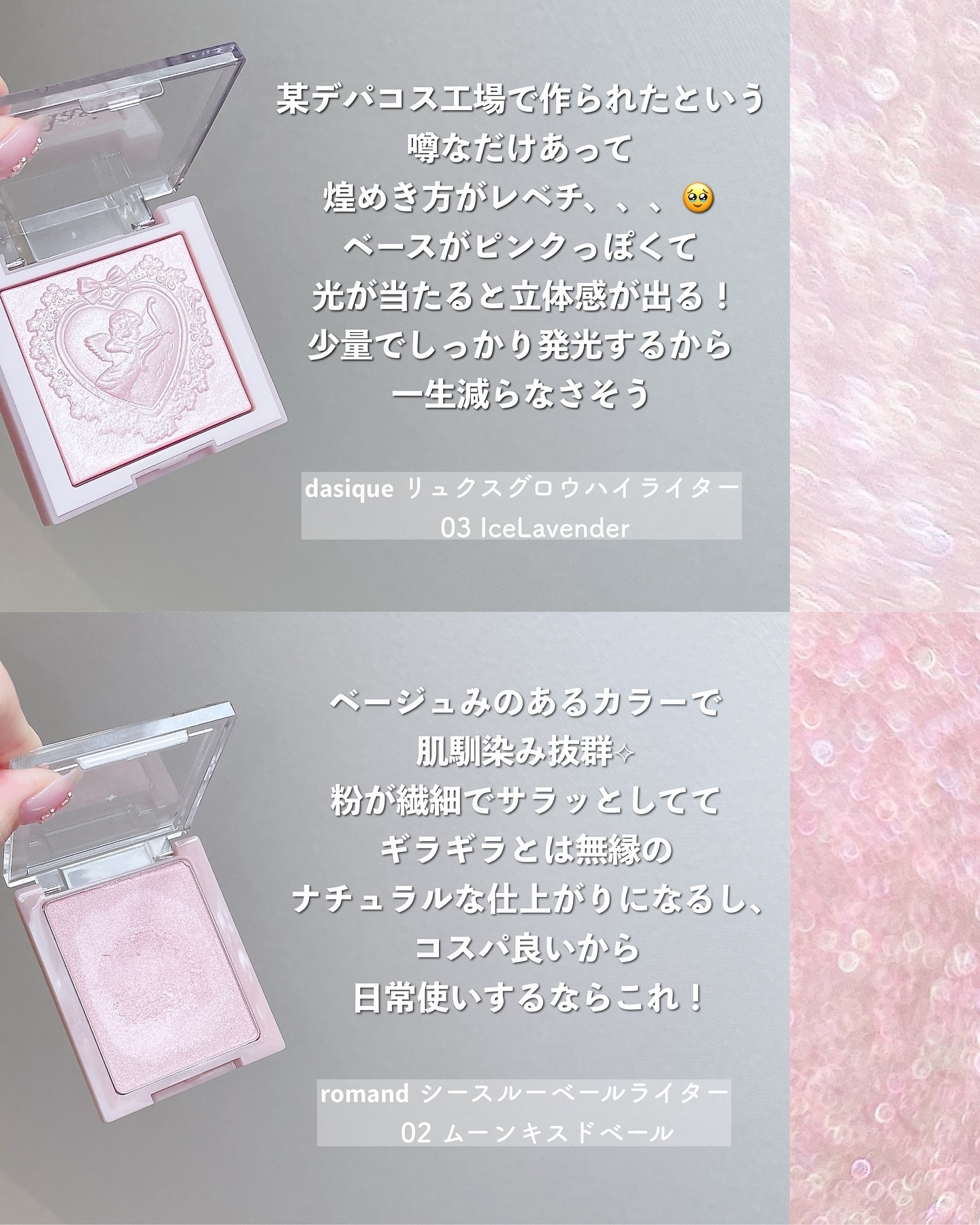 光が当たるとピンクがキラッとかわいい! イメージ通りのツヤで大満足☺️ ピンクすぎるのは嫌だし、ギラギラは苦手だし、でも控えめは物足りないし、たくさん迷ってrom&ndに決めました! ただ毛穴は目立ちやすいかなと思いましたので、塗る位置は注意が必要です!