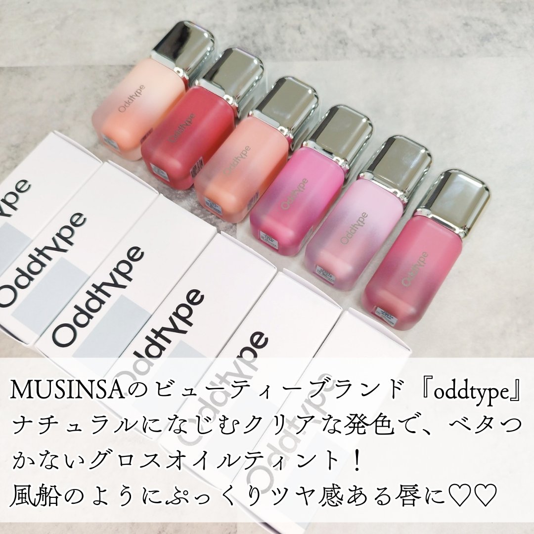 oddtypeは、2024年10月に日本上陸。 あの”MUSINSA”のビューティブランド✨ ボリューム感のあるぷるっぷるの艶ティント💋 斜めカットのブラシが珍しいの! ぷっくりとしたボッテリ感が可愛すぎる…❤️🔥 バラエティショップで購入できるので、チェックしてみてねーー♡