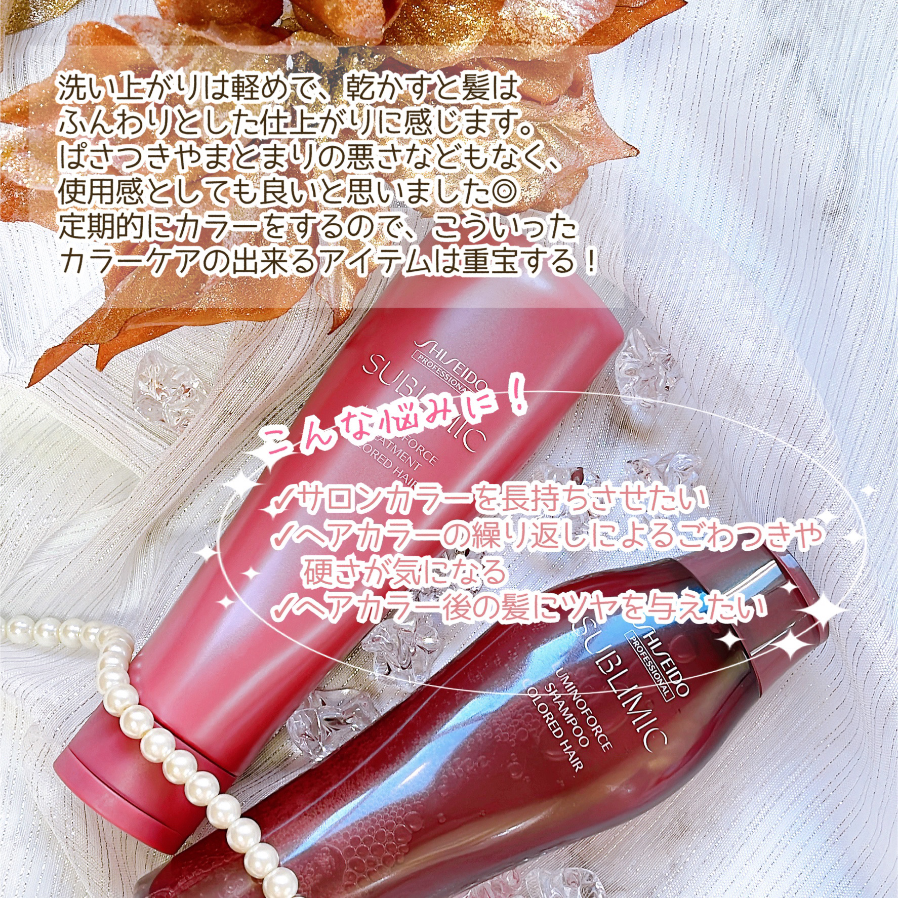 髪本来の美しさを目覚めさせる 資生堂プロフェッショナル サブリミック ルミノフォース サロン専売のヘアケアブランドで サロントリートメントがメインのブランドのホームケアを使うことで ローズの香りが広がって この香りを嗅ぐと「幸せな気持ち」に🥰