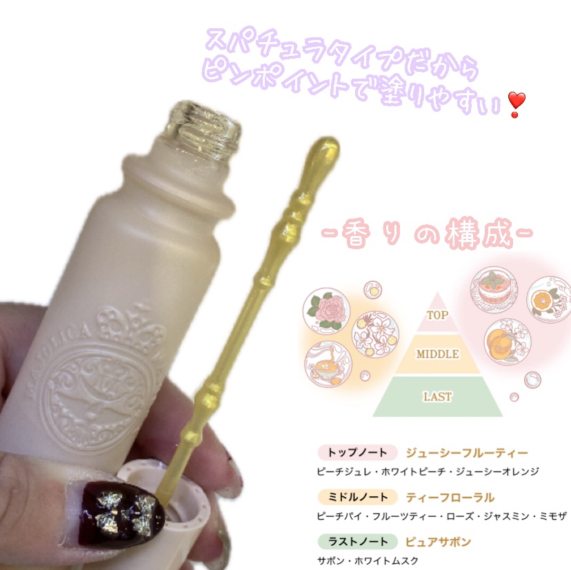 新作マジョロマンティカはピーチパイとフローラルサボンの香り🍑🫧 スティックで付けるタイプのとろ~りとした香水は少量手首に付けるだけでしっかり香ってくれます。 よりキュートでフレッシュな香りが私好みでした♡