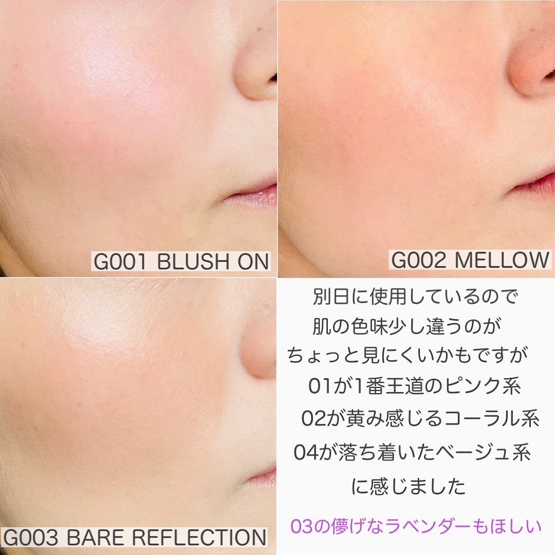 - <G001 ブラッシュオン> マイカ、タルク、リンゴ酸ジイソステアリル、水添ポリ(C6-14オレフィン)、ジメチコン、合成フルオロフロゴパイト、酸化チタン、(ジメチコン/ビニルジメチコン)クロスポリマー、ラウリン酸ヘキシル、シリカ、ペンチレングリコール、トリエトキシカプリリルシラン、赤226、酸化鉄、グンジョウ、黄4、酸化スズ、ラウロイルリシン、水酸化Al <G002 メロウ> マイカ、タルク、リンゴ酸ジイソステアリル、水添ポリ(C6-14オレフィン)、ジメチコン、酸化チタン、(ジメチコン/ビニルジメチコン)クロスポリマー、ラウリン酸ヘキシル、シリカ、合成フルオロフロゴパイト、ペンチレングリコール、トリエトキシカプリリルシラン、赤226、酸化鉄、黄4、グンジョウ、ラウロイルリシン、水酸化Al、酸化スズ <G004 ベアリフレクション> 合成フルオロフロゴパイト、リンゴ酸ジイソステアリル、水添ポリ(C6-14オレフィン)、マイカ、タルク、ジメチコン、酸化チタン、(ジメチコン/ビニルジメチコン)クロスポリマー、ラウリン酸ヘキシル、シリカ、酸化鉄、ペンチレングリコール、トリエトキシカプリリルシラン、酸化スズ、ラウロイルリシン、水酸化Al