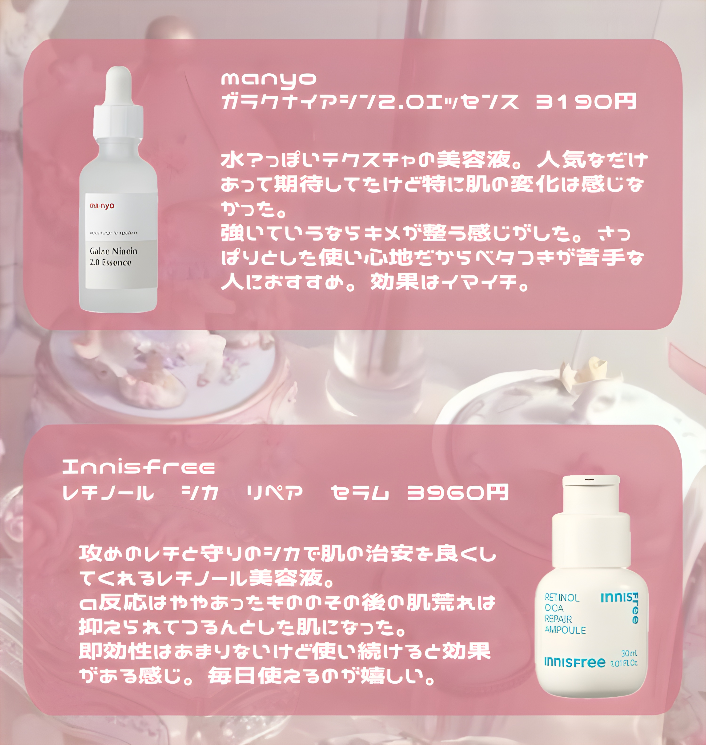 アヌアのレチノール美容液は鼻の毛穴ケアに、ナンバーズインの美容液は保湿に使っています。特にナンバーズインの方は使って1ヶ月経つけど肌つやがすごい!最近すっぴんでも発光してます笑 レチノールはA反応出にくいそうだけど私はおでこと眉間が少しだけ剥けた(すぐ治った)ので乾燥肌・敏感肌の人は少しずつ使うのをおすすめします。