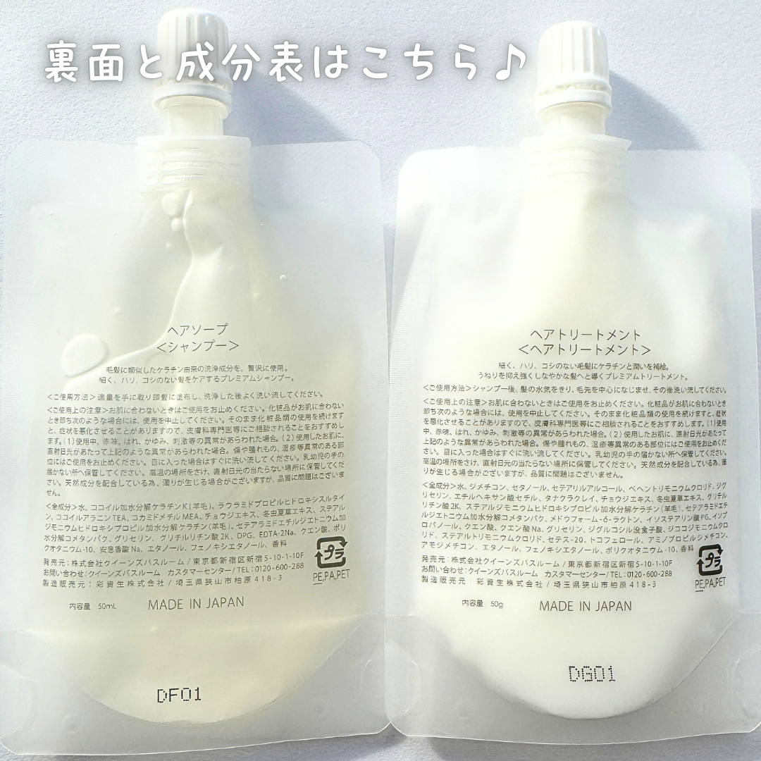 - ●ヘアソープ 水、ココイル加水分解ケラチンK(羊毛)、ラウラミドプロピルヒドロキシスルタイン、ココイルアラニンTEA、コカミドメチルMEA、チョウジエキス、冬虫夏草エキス、ステアルジモニウムヒドロキシプロピル加水分解ケラチン(羊毛)、セテアラミドエチルジエトニウム加水分解コメタンパク、グリセリン、グリチルリチン酸2K、DPG、EDTA-2Na、クエン酸、ポリクオタニウム-10、安息香酸Na、エタノール、フェノキシエタノール、香料 ●トリートメント 水、ジメチコン、セタノール、セテアリルアルコール、ベヘントリモニウムクロリド、ジグリセリン、エチルヘキサン酸セチル、タナクラクレイ、チョウジエキス、冬虫夏草エキス、グリチルリチン酸2K、ステアルジモニウムヒドロキシプロピル加水分解ケラチン(羊毛)、セテアラミドエチルジエトニウム加水分解コメタンパク、メドウフォーム-δ-ラクトン、イソステアリン酸PG、イソプロパノール、クエン酸、クエン酸Na、グリセリン、ジグルコシル没食子酸、ジココジモニウムクロリド、ステアルトリモニウムクロリド、セテス-20、トコフェロール、アミノプロピルジメチコン、アモジメチコン、エタノール、フェノキシエタノール、ポリクオタニウム-10、香料