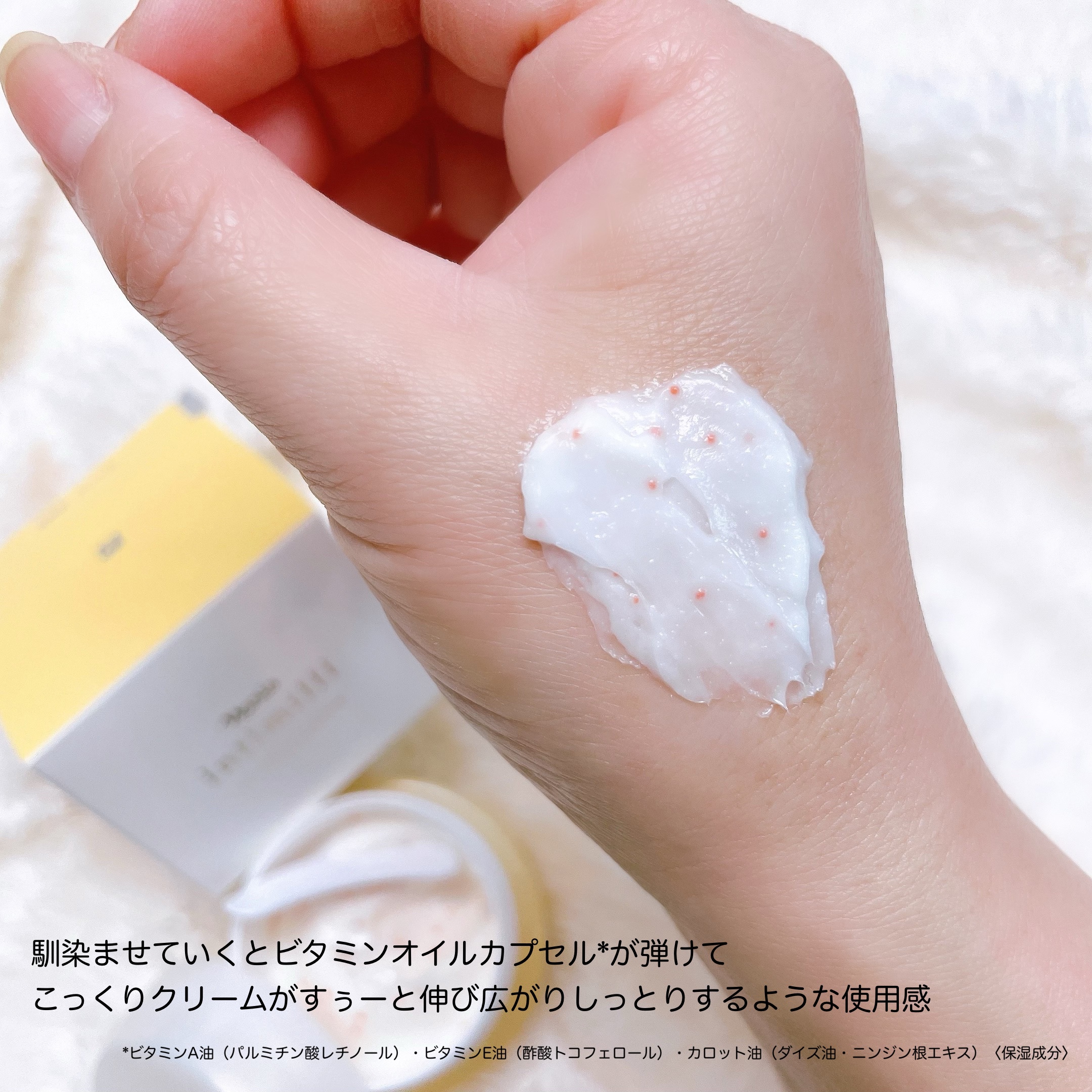 「とろける」×「弾ける」のWのオイル効果で、手ごわい乾燥に立ち向かう高保湿クリームなのだとか。 肌になじませるとビタミンオイルカプセルが弾け、美容オイルがあふれ出てビタミンオイルがクリームになじむことでなめらかな感触へと変化し、角層のすみずみまで潤いで満たし、やわらかくほぐしてイキイキとした印象を与えくれるというので魅力的に思います。 オイル美容が気軽に取り入れられて、これからの乾燥の季節に活躍してくれそうです。
