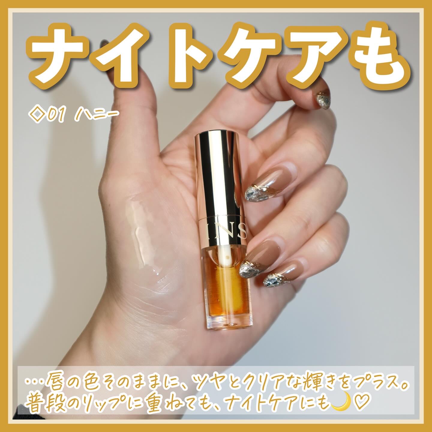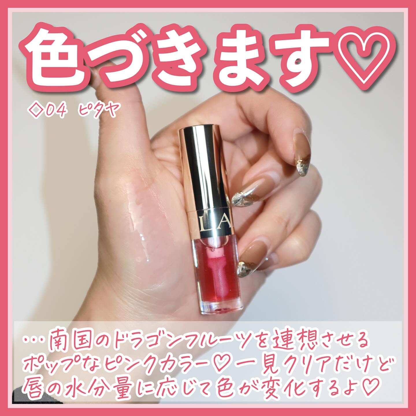 さらっとしたオイルでベタつかずツヤツヤな仕上がり✨ 色んな色があってどれもかわいい〜😍 03,04,08は水分に反応して色が変わるとのことで確かにスウォッチ直後より数秒あとのほうが色が濃くなってた! トリートメント効果が高いから寝る前のリップケアにもおすすめなんだって〜🤩
