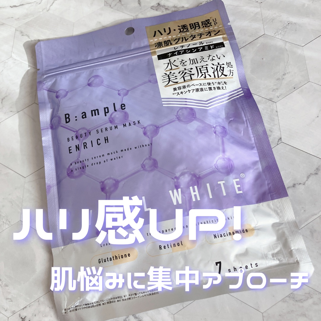 ハリ、透明感(キメが整ってなめらかな肌の状態)アップ! グルタチオン(保湿成分)レチノール(保湿成分)ナイアシンアミド(保湿成分) たっぷり美容液を含み、ぴたっと密着する特性シートなんだって。 着色料 香料 鉱物油 パラベン エタノール 合成ポリマーは入っていないみたいです。