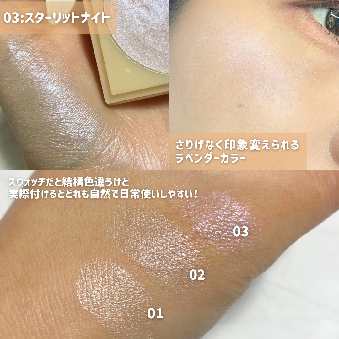 オイルin処方でパウダレスな透明感とツヤを演出。 高密着でフィットし付けたての質感をキープ! 見た目によらず、しっかり光るタイプのハイライト。 仕上がりはセザンヌに似てるかも? ティントイルミネーターとだけあって、肌に張り付くように密着します。 指塗りだと広げにくかったです。