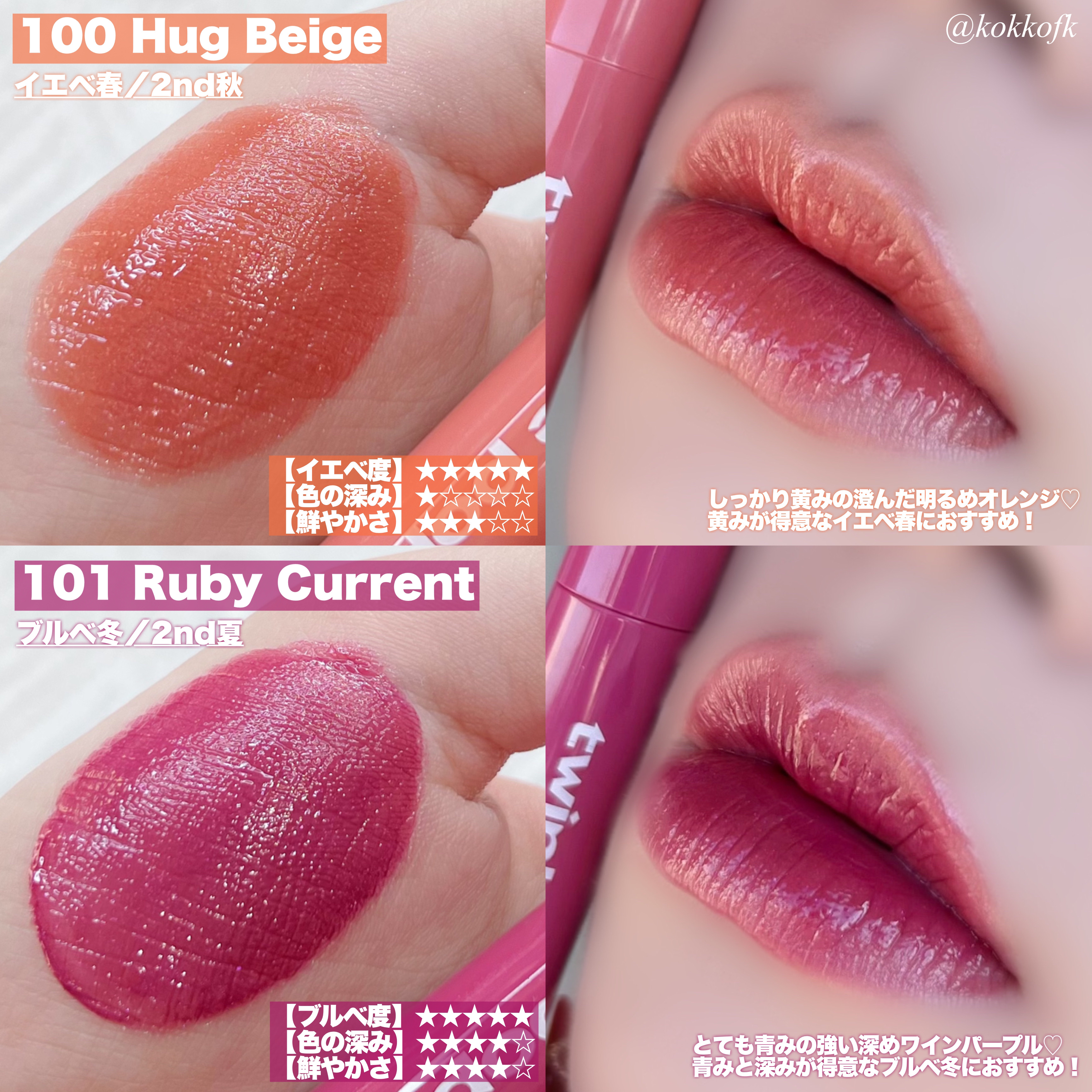 既存のジューシーラスティングティントよりさらに軽いツヤ感が魅力の新作ティント! 色選びの参考にしてね! やや黄みの明るいオレンジコーラル鮮やか得意なイエベ春におすすめ! 黄みの明るくまろやかなオレンジベージュ黄みが得意なイエベ春におすすめ! 青み黄み中間なくすみピンクベージュブルベ夏やイエベ春におすすめ 黄みの深くて鮮やかなオレンジレッド鮮やか得意なイエベ秋におすすめ! 青みの鮮やかで明るいビビッドピンク明るさ得意なブルベ冬やブルベ夏におすすめ! 青みの明るめで柔らかいローズピンクブルベ夏やブルベ冬におすすめ! 青み黄み中間な鮮やかで強いビビッドレッド2ndイエベ春のブルベ冬におすすめ! 青みの強い深くて鮮やかなベリーレッド2nd夏で鮮やか得意なブルベ冬におすすめ!