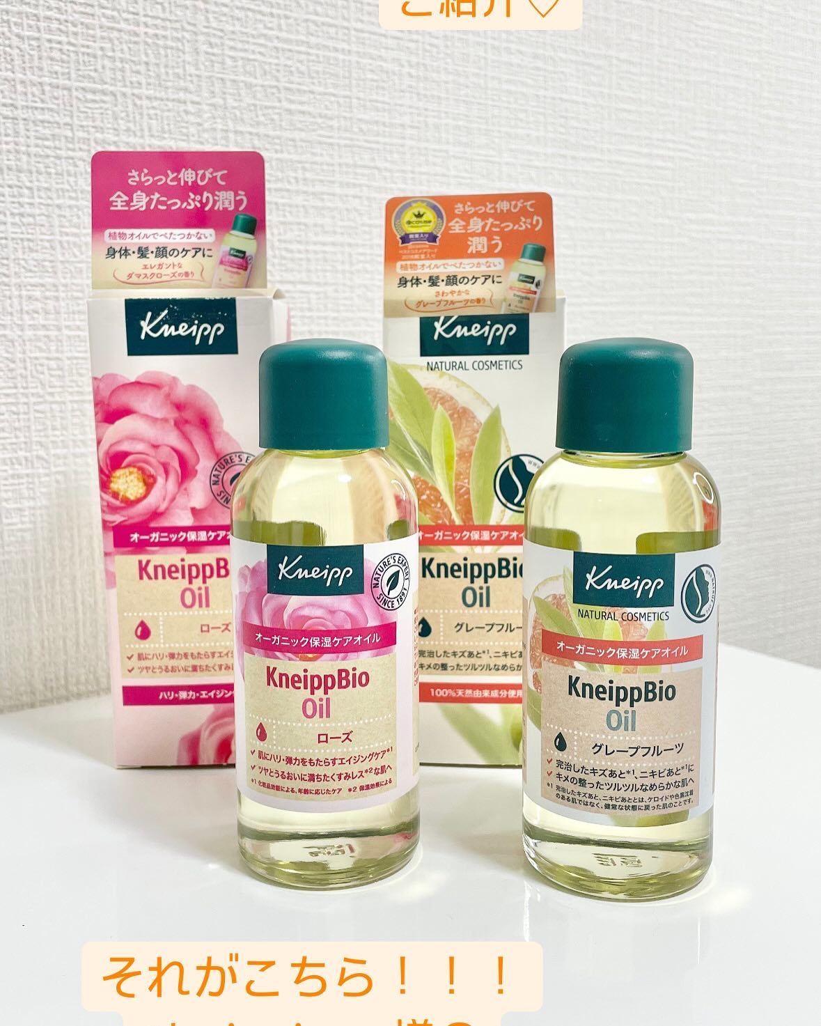 クナイプのオーガニック保湿ケアオイルは100%天然由来成分使用🌿顔だけでなく全身使えるのはもちろん、濡れた肌にも使えちゃうの知ってましたか? サラサラしていて伸びもとっても良し👌ベタつかないなめらかな使用感で、オイル美容初めての方にもおすすめです♡ グレープフルーツとローズの2種類あり香りや用途に合わせて使い分けできます🫶