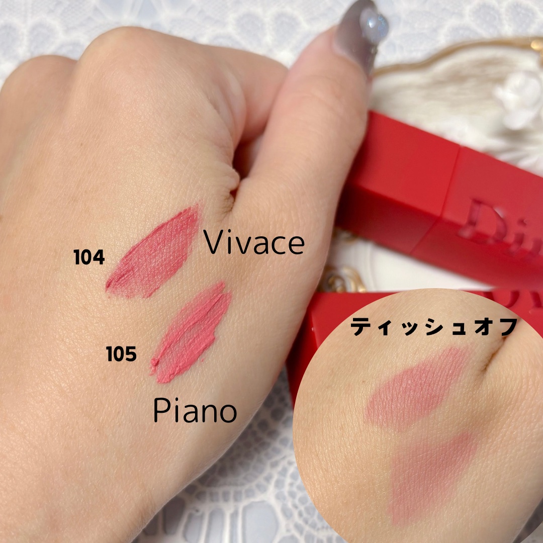 薄く密着するスフレのようなテクスチャー。縦シワが目立って汚く見えるようなこともなく、加工したようなふわふわマットリップに仕上がります😆 104はグレイッシュモーヴプラム、105はシュガーピンクカラー。私の唇では104は公式画像よりもより鮮やかで赤み寄りに、105は公式画像よりも彩度が低く白みが強い色味に発色しました。 唇に染み込むような馴染み方をするので、唇だけが浮くことがないところが好きです❣️