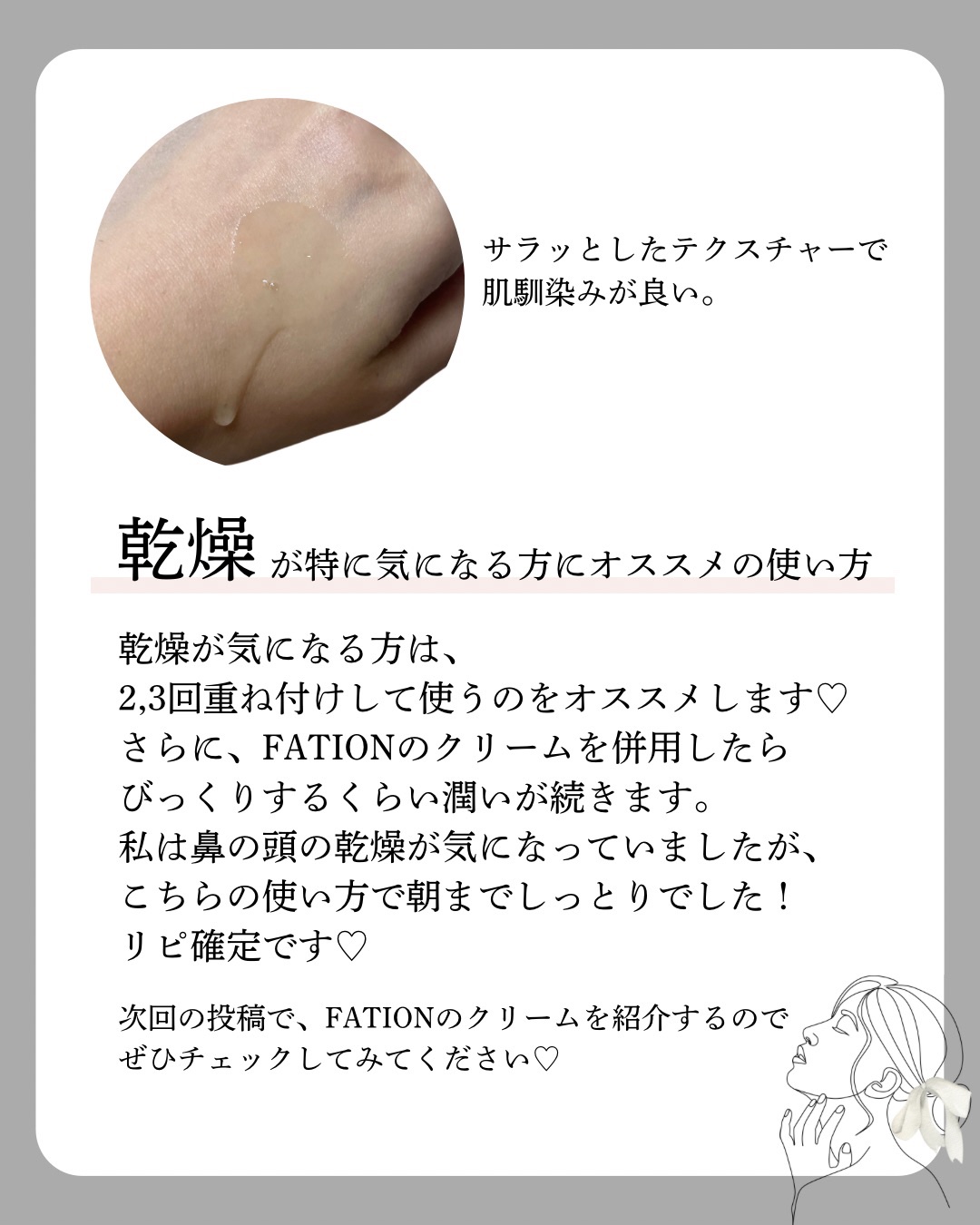 | とろみのあるテクスチャーだけど、肌にのばすとさらっとしていてみずみずしい使用感だよ☺️ | 詳細を見る | |