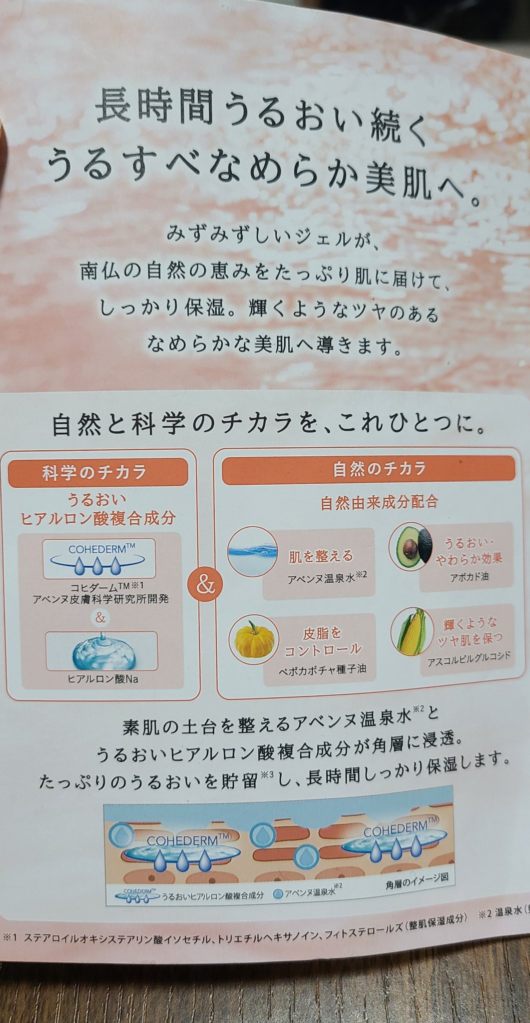 - <50ml > 温泉水、グリセリン、トリ(カプリル酸/カプリン酸)グリセリル、(アクリル酸ヒドロキシエチル/アクリロイルジメチルタウリンNa)コポリマー、ステアロイルオキシステアリン酸イソセチル、トリエチルヘキサノイン、ミリスチン酸ポリグリセリル-10、1,2-ヘキサンジオール、アスコルビルグルコシド、ベタイン、ペポカボチャ種子油、アボカド油、フィトステロールズ、ポリソルベート60、ヒアルロン酸Na、スクワラン、トコフェリルグルコシド、ベヘニルアルコール、カプリリルグリコール、カラメル、クエン酸、水酸化K、プロパンジオール、クエン酸Na、イソステアリン酸ソルビタン、水、キサンタンガム、香料 <100ml > 温泉水、グリセリン、トリ(カプリル酸/カプリン酸)グリセリル、(アクリル酸ヒドロキシエチル/アクリロイルジメチルタウリンNa)コポリマー、ステアロイルオキシステアリン酸イソセチル、トリエチルヘキサノイン、ミリスチン酸ポリグリセリル-10、1,2-ヘキサンジオール、アスコルビルグルコシド、ベタイン、ペポカボチャ種子油、アボカド油、フィトステロールズ、ポリソルベート60、ヒアルロン酸Na、スクワラン、トコフェリルグルコシド、ベヘニルアルコール、カプリリルグリコール、カラメル、クエン酸、水酸化K、プロパンジオール、クエン酸Na、イソステアリン酸ソルビタン、水、キサンタンガム、香料