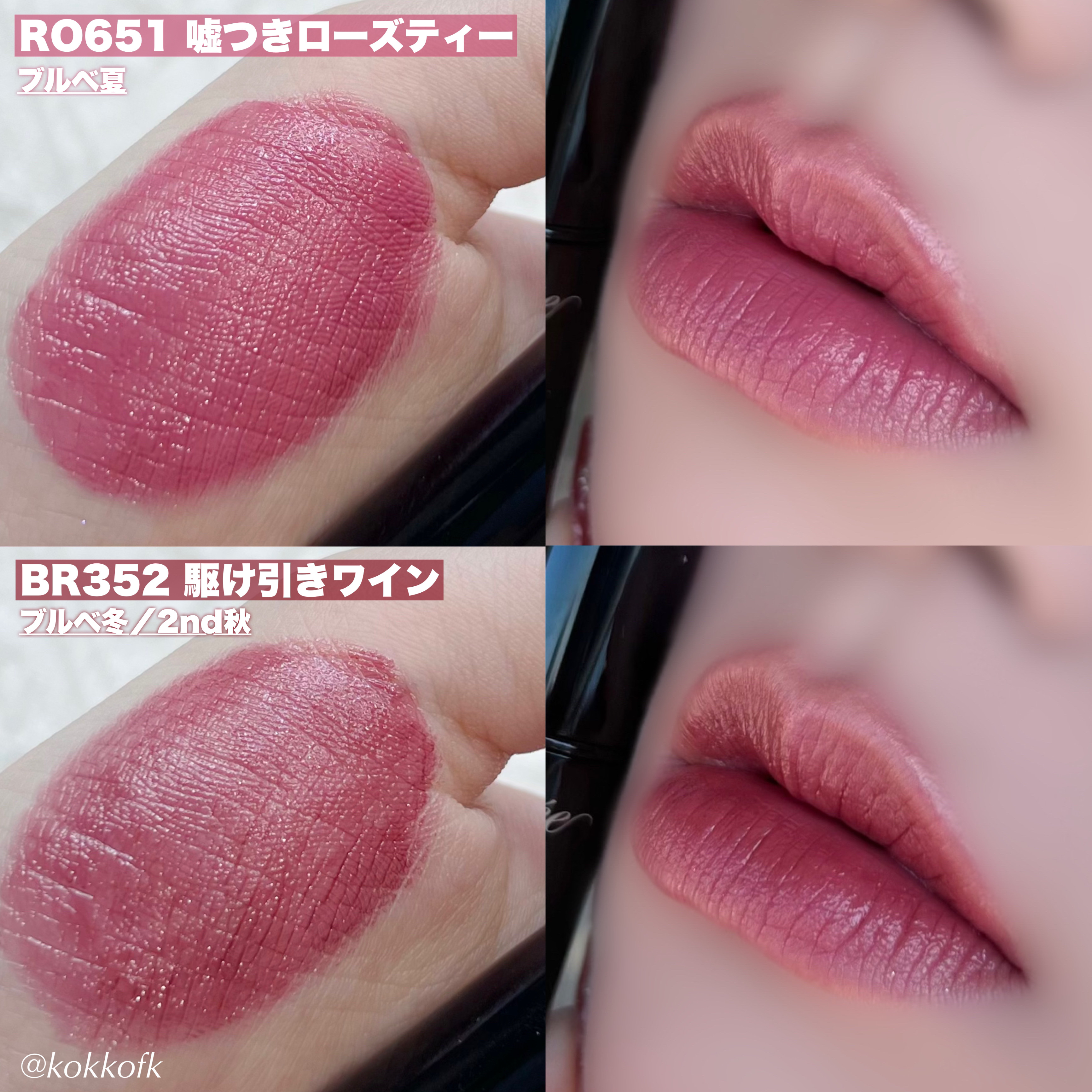 薄く唇に密着する新作マットティント。 マットなのにかなりしっとりとしていて 乾燥を感じなくてびっくりでした! 一気にこなれ感が出るトレンドカラーです♡ やや青みの華やかローズレッド 公式画像より鮮やかめに感じました。 やや黄みの強くて深いオレンジレッド ストロングオータムに超激推しです! やや黄みの非常に深く濃いダークブラウン ディープオータムに激推しです! かわいい雰囲気になれるピンクリップです♡ やや青みの柔らかいくすみピンクベージュ ミューテッドサマーにおすすめです! 青みの落ち着いたローズピンク やや青みのとても鮮やかなビビッドレッド ビビッドウィンターに特におすすめ! 既存マットティントよりもさらに ふわふわなマット感が魅力のリップで、 軽くティッシュオフしてもほとんど落ちない◎ マスクにも激推しのティントなので、 ぜひ皆さんもチェックしてみてね❤︎