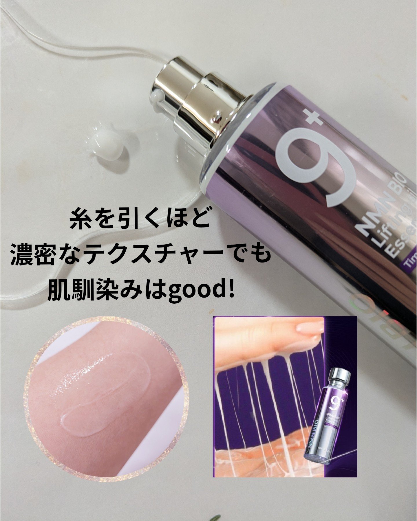 高濃縮NMN × ペプチド50ユニットで実現する弾力シナジー! NMN BIOエラスチンファイバーがゆるんだ肌の内側からハリ与え立体的なボリューム感をもたらすタイムリバース濃縮美容液。 とろみのある乳液タイプのクリームでスルスルと伸びがよくつけられます。