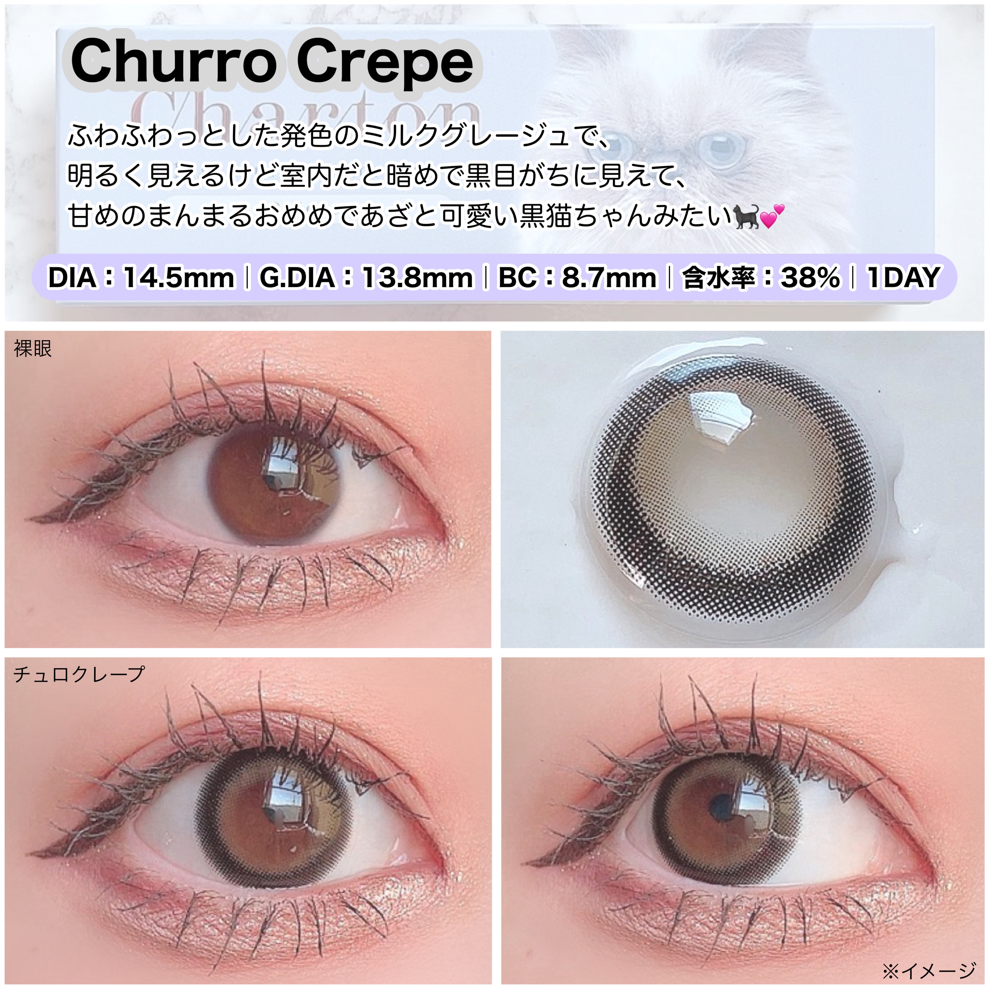 ✼••••✼Charton1day✼••••✼ChurroCrepeDIA:14.5mm/着色直径:13.8mm/BC:8.7mm/含水率:38.0%中毒性のある太フチとミルクグレージュの優しい発色で罪な可愛さに✨とにかく盛れて、パケも可愛く...