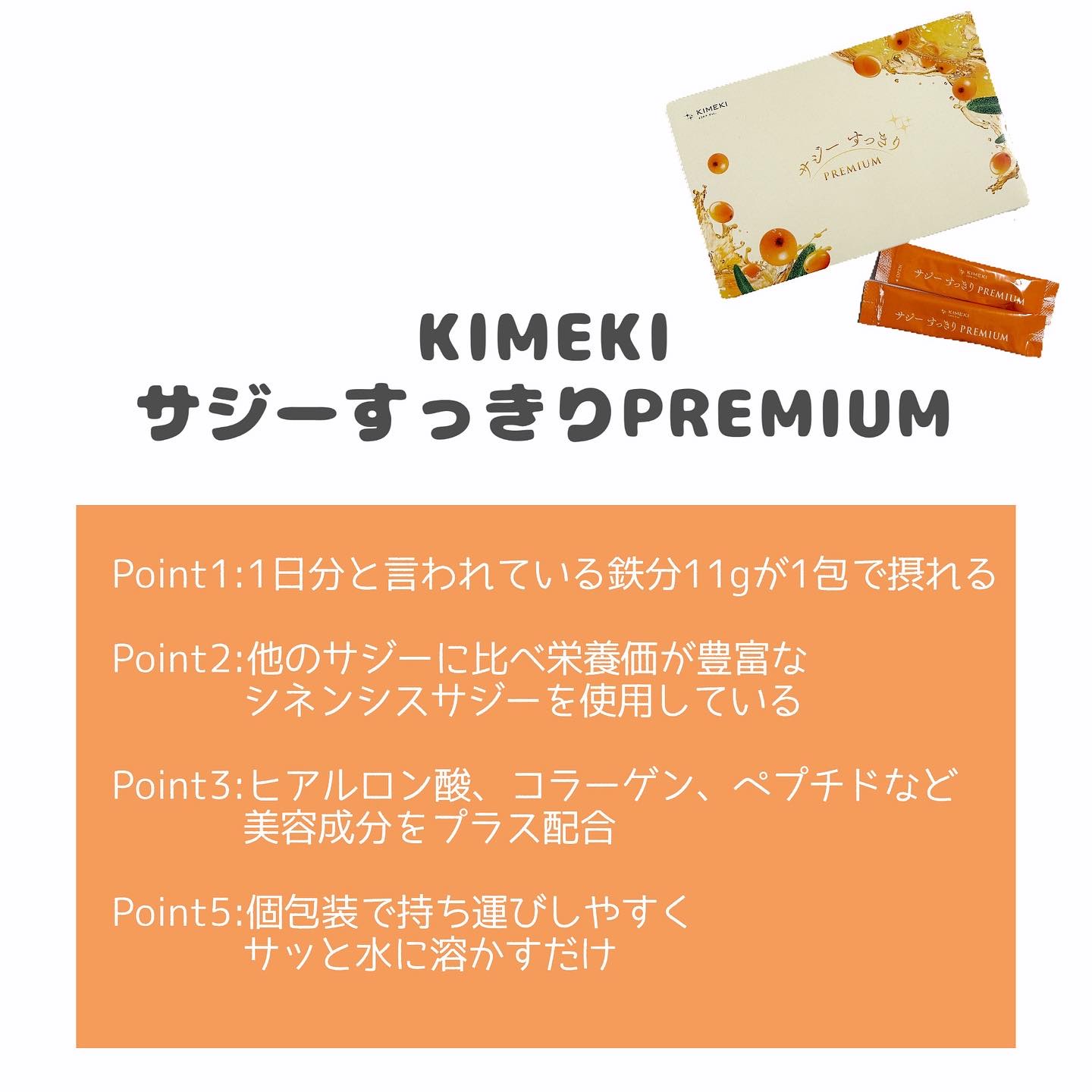 KIMEKI(キメキ)の『サジーすっきりPREMIUM』で美味しく鉄分摂取🍊🫧果実の中で最も鉄分が豊富なサジーを使ったドリンクは、独特の酸味があるものが多い。。なのに、サジーすっきりPREMIUMは本当に飲みやすい😲✨顆粒タイプで持ち運びにも...