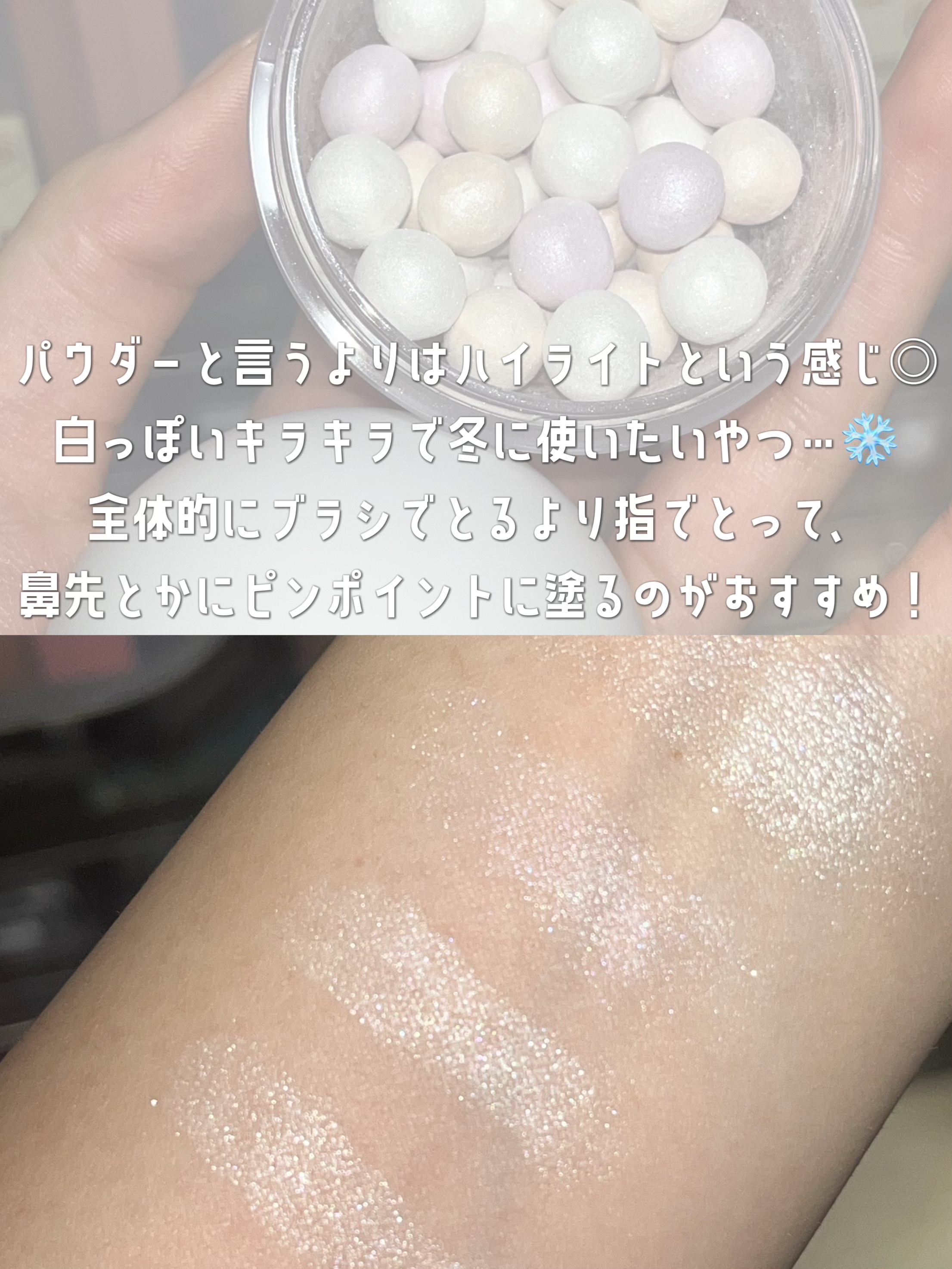 - ※揺れや衝撃に弱い商品です。 配送過程で玉の形が崩れたり容器内部にパウダーが付着する場合がございますので、ご購入の際はあらかじめご了承ください。 尚、使用には問題ございませんので、安心してご使用ください。 パウダーなので、油分をしっかり抑えてくれて肌のキメを整える。 繊細なパールが輝いてくれて、ハイライト効果◎。 ツヤやかで肌馴染みのよい3色のシアカラーで構成されていてナチュラルに発色。 (2024年10月12日より全国のロフトにて(一部店舗を除く)にて数量限定発売)