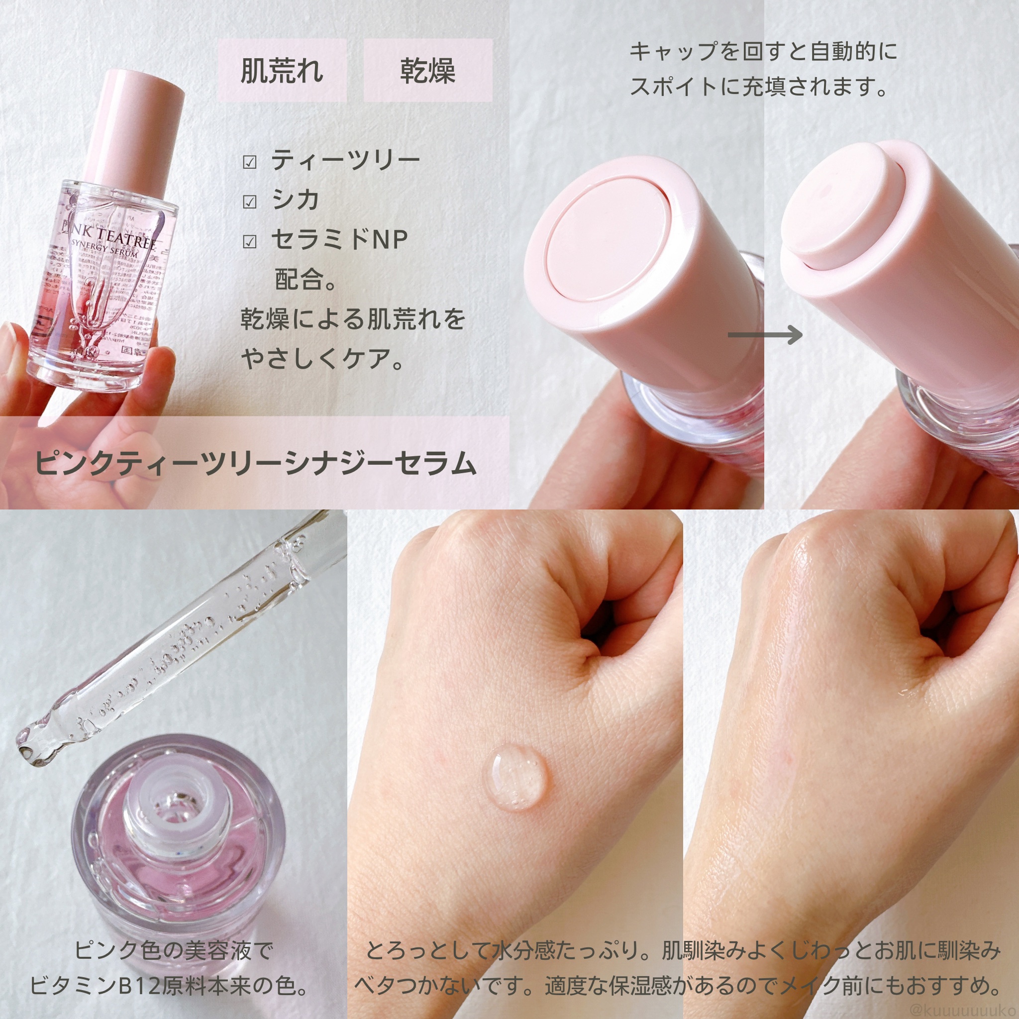 APLINの『ピンクティーツリーシナジーセラム』はティーツリーとシカエキス配合のニキビ・肌荒れ悩みをケアしてくれる美容液💗 このピンクカラーは人口色素を一切排除し原料本来のビタミンB12成分のカラーで、荒れた肌に水分と活力を与えお肌の調子を整えてくれます❣️ キャップを回すと自動的に一回分のセラムがスポイトに吸い上げてくれるので、量を調節したりせずとっても便利✨