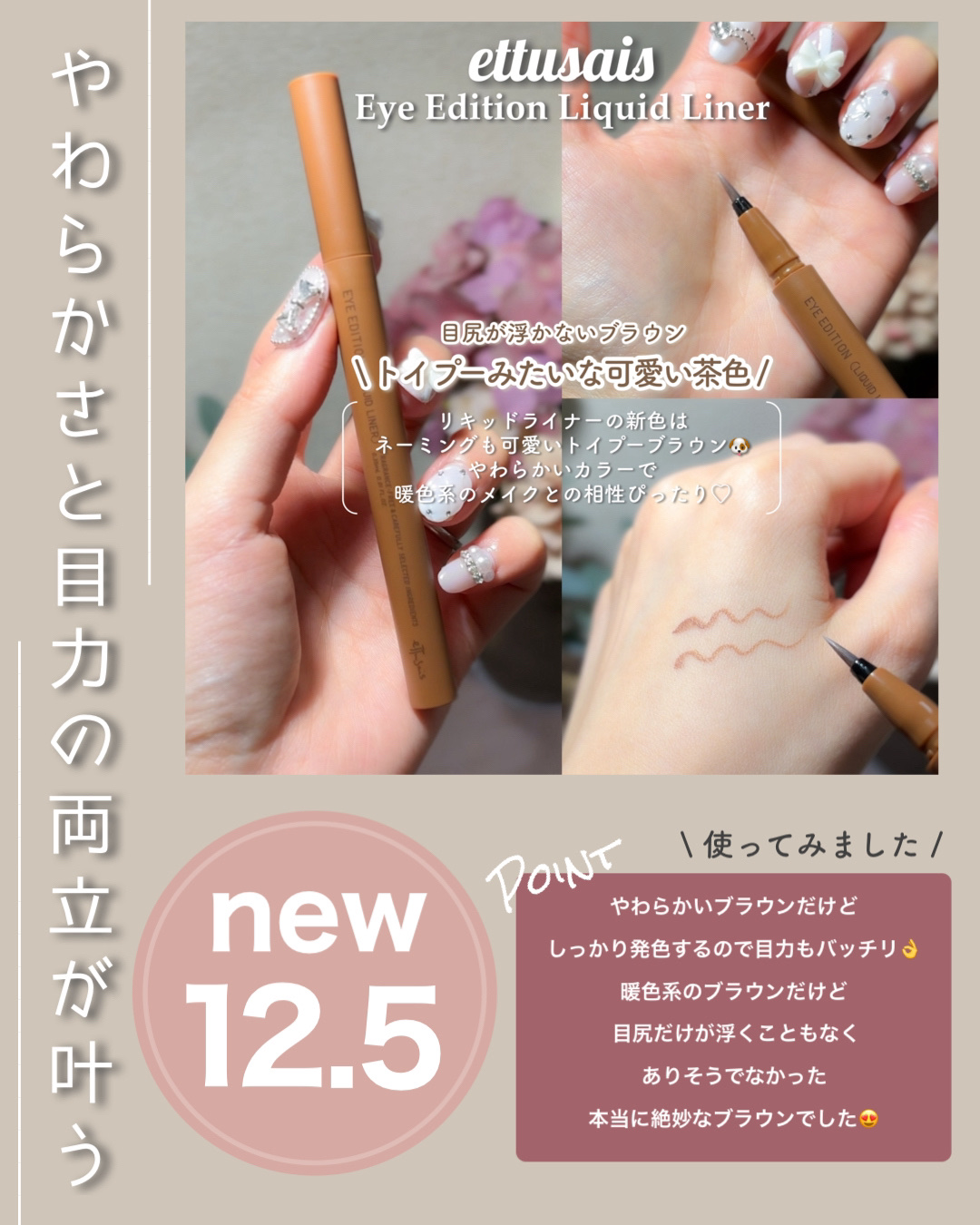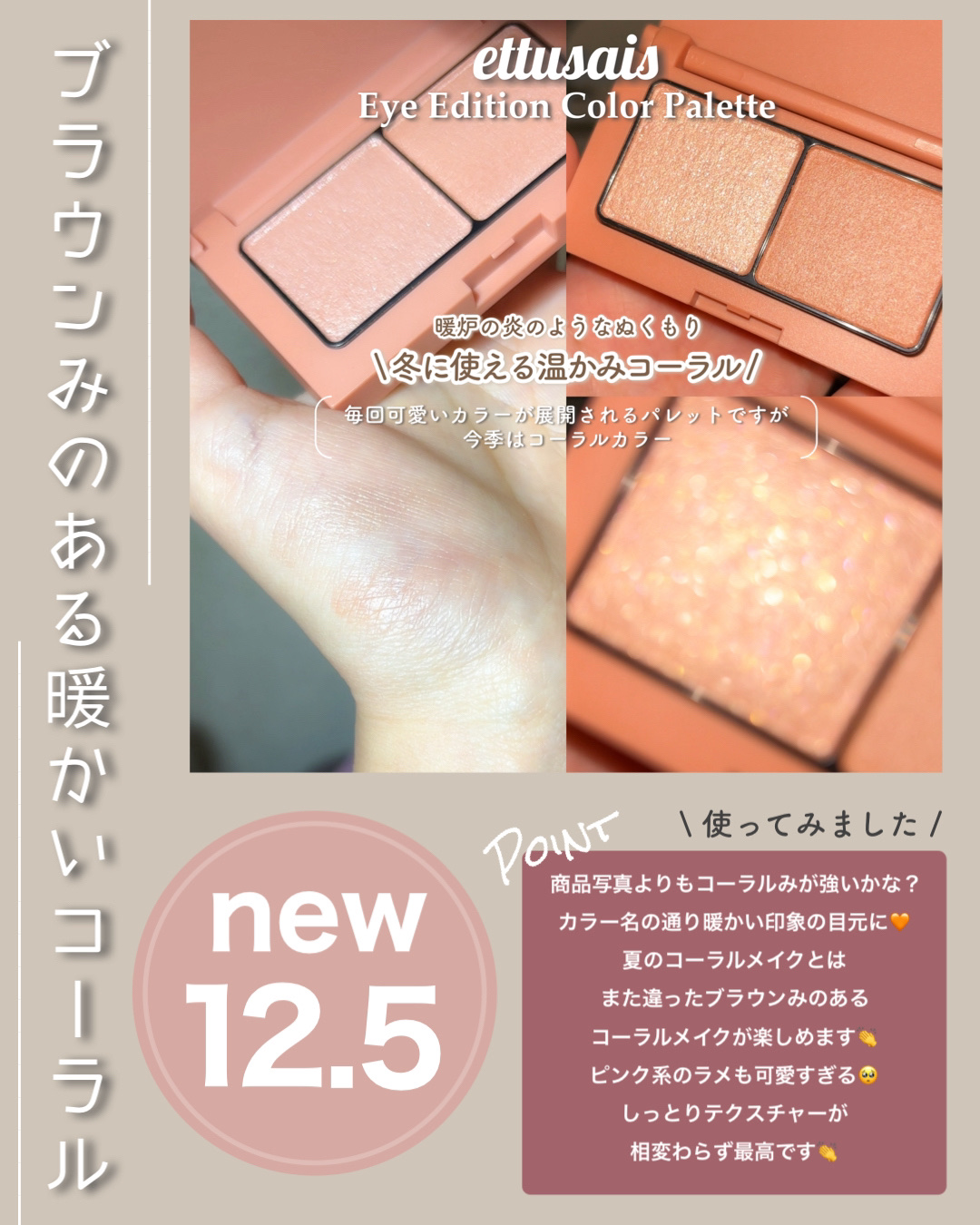 カラーパレットは肌映えする、ぬくもりコーラル ほどよい血色感とキレイなラメで目元がパッと明るくなる✨ 万人受けのトイプーブラウン 誰でも使いやすいよねっていう安定のブラウン! ettusaisのコスメはシンプルだけどちゃんと映える🫶🏻