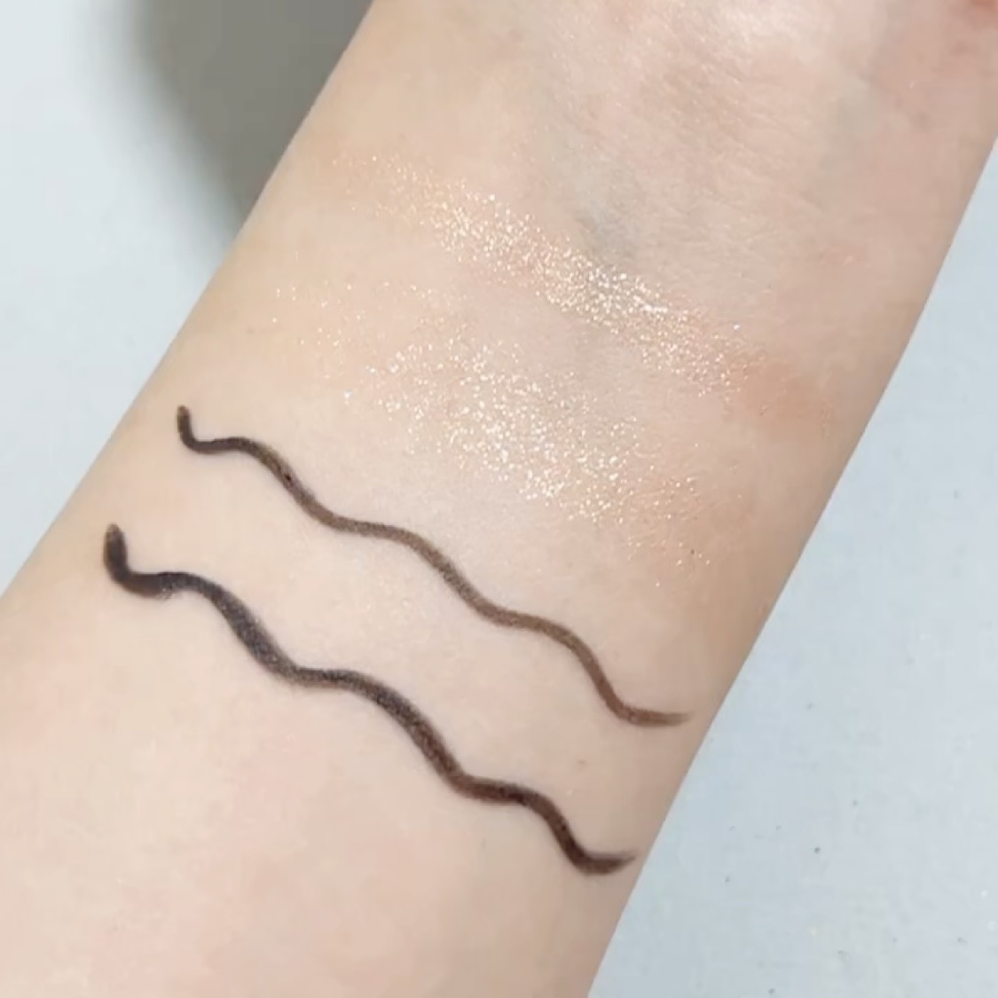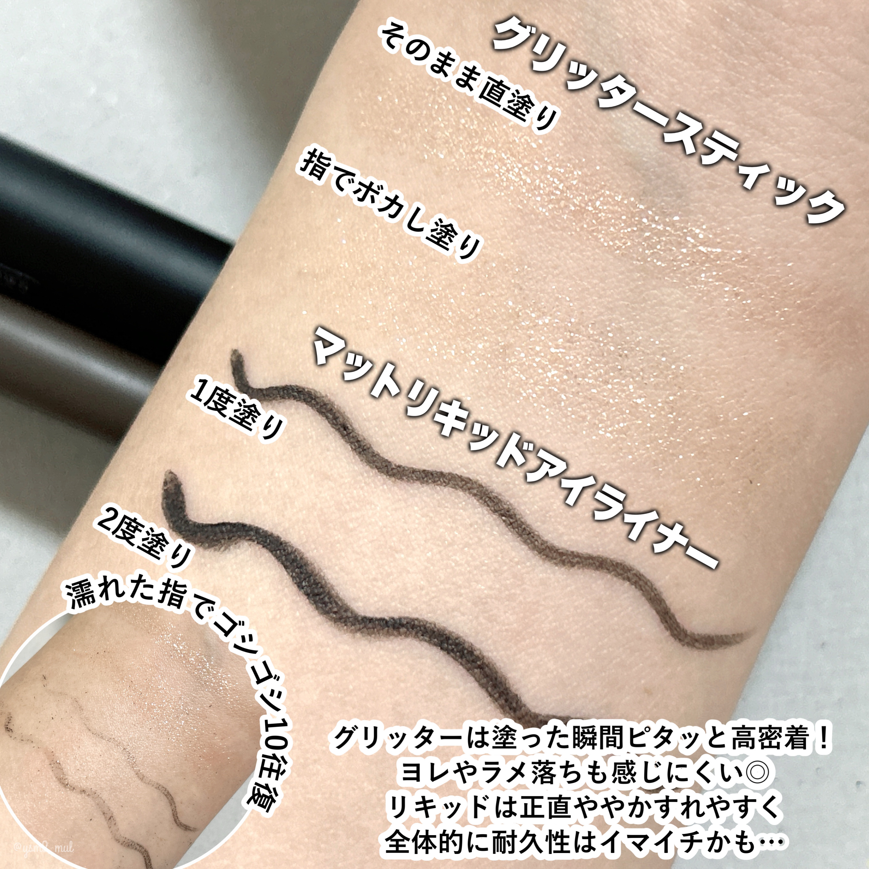 涙袋、アイシャドウ、ハイライトとして使えるアイテム! するするなめらかに使えて高密着💫ラメ飛びしにくいです! マット仕上げのリキッドアイライナー! 変にテカったりする感じなく肌馴染みがいい。 細いラインも描きやすく絶妙なグレージュカラーが使いやすいよ🤍