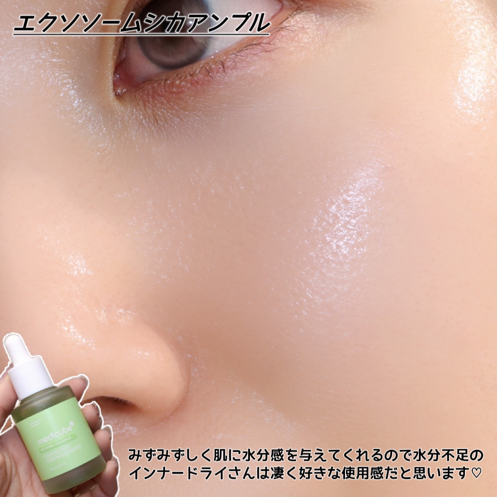 ニキビ鎖静成分84%の高濃縮アンプル🌿 ナイアシンアミド*1配合で、ニキビと美白*2ケアにも◎ エクソソームシカ*3とは?毛穴より510倍小さいサイズで、強力な鎮静効果があるツボクサのごく少量の核心組織を抽出した肌荒れ鎮静成分なんだって。 緑色のとろんとジェルテクスチャーで、みずみずしくなめらかになじみやすい✨