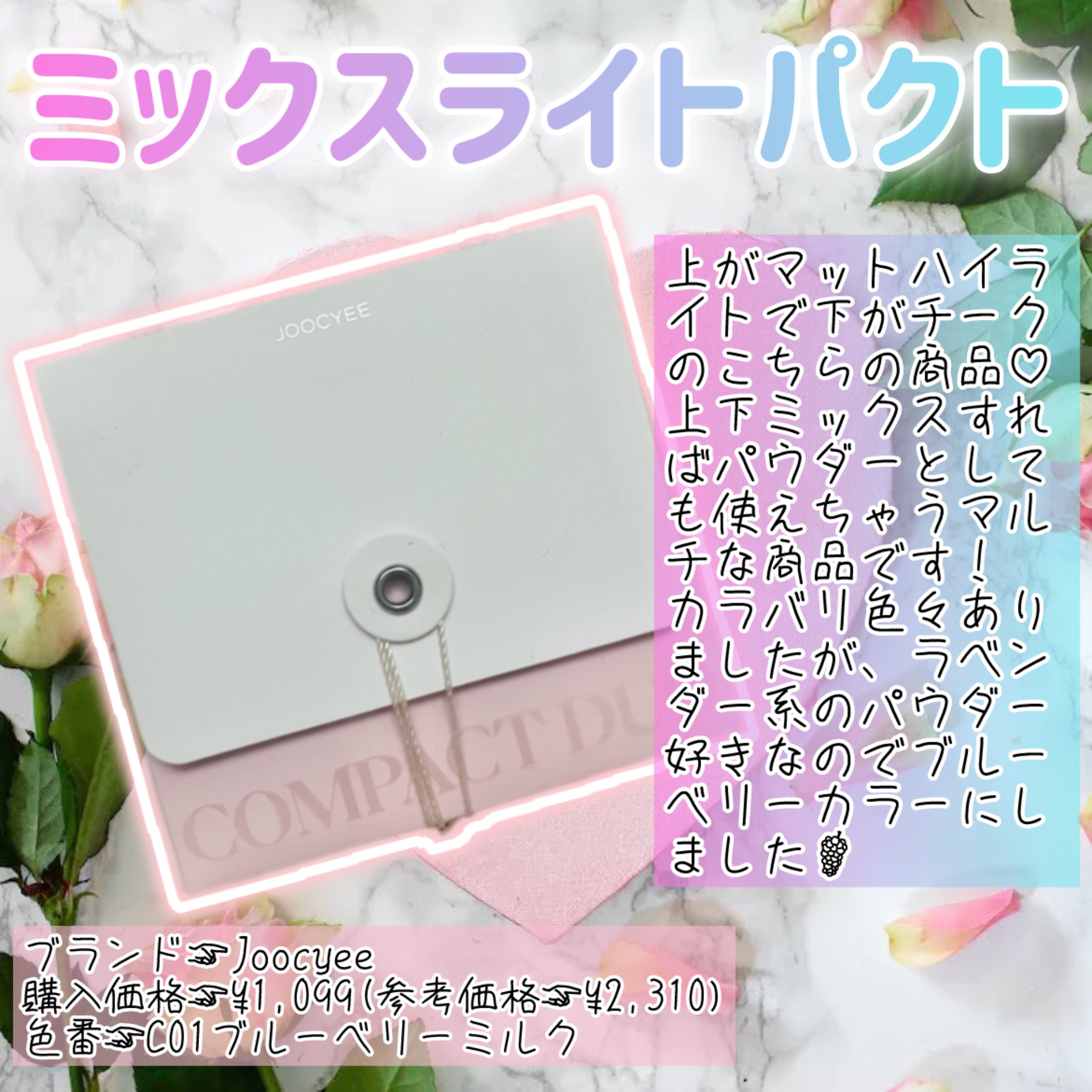 【ブルーベリーなミルキー色♡3役パウダー!】JoocyeeミックスライトパクトC01ブルーベリーミルク参考価格2,310円(税込)外箱から既に可愛い「ジューシー」のパウダー♡これ、ピンクハイライトとパープルチークがセットされているんだって!し...
