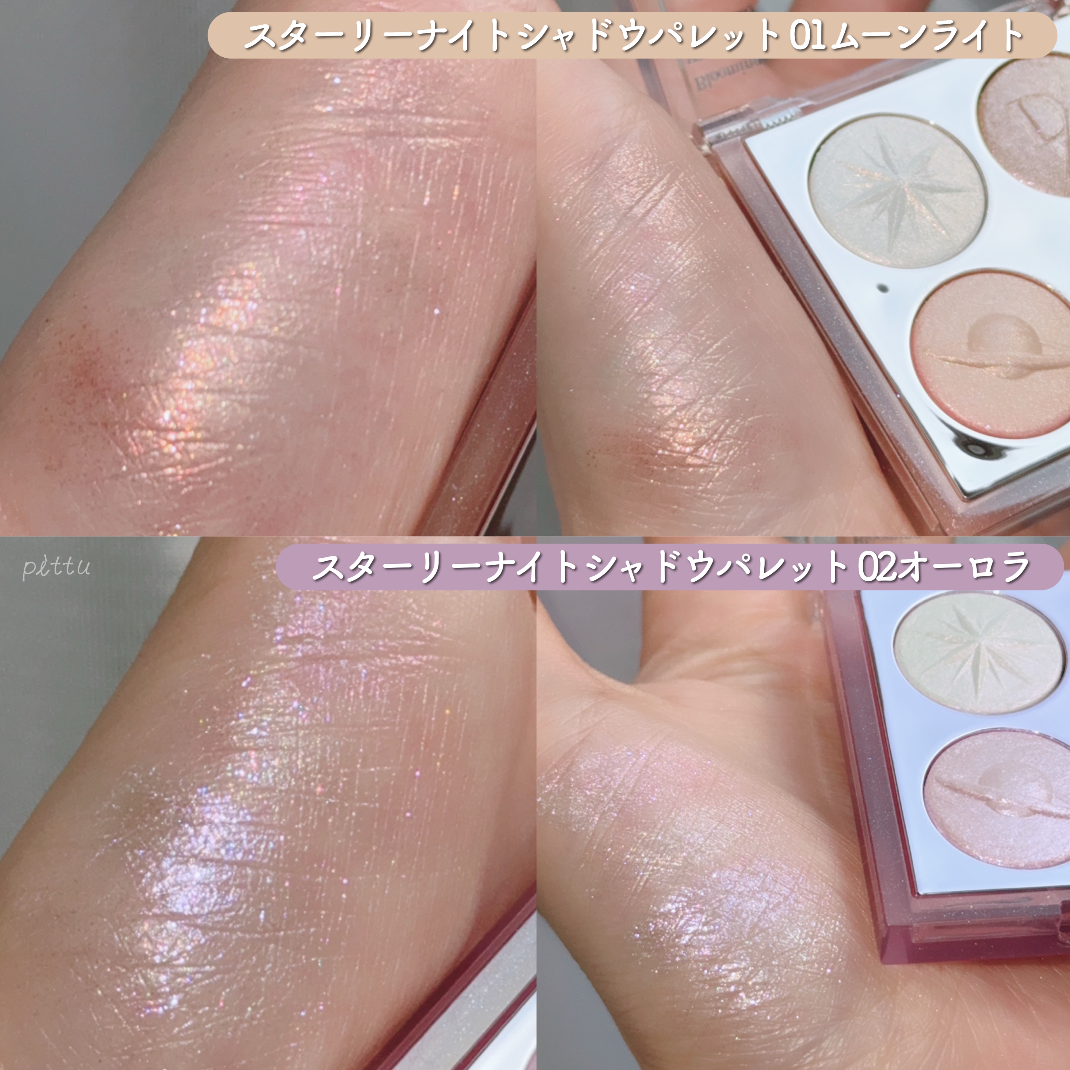 カラバリは2色展開、公式情報がないので不安ですがどうやら限定販売のようです! 01 プリュムフラワー ピンクベージュ系でまとめられたパレット 全体的にライトなピンクが多く、イエベ春の方向きに感じます 02 ボヌールマロン 赤みのあるカラーでまとめられたパレット 明るいカラーもありますがベージュや赤みブラウン等イエベ秋の方向きに感じます 表面のエンボス加工もかわいいのばっかりですね! ラメ強めが格子柄だからわかりやすいし、まとまりが良い⸜(๑⃙⃘'ᵕ'๑⃙⃘)⸝⋆* ちなみにこちらのパレットは8色も入っているのにかなりコンパクトで、1色の大きさが私の親指の爪よりちょい大きめという嬉しさ…! フタの水面のデザインは内側だけに施されているので、表面はツルッとしていますよ🌊 チップもふわふわで、多色パレット専用のサイズ感で長めなのが嬉しい♪ とにかく話題になっているこちら、可愛すぎるから在庫無くなるのお願い待って…🙏🏻💦