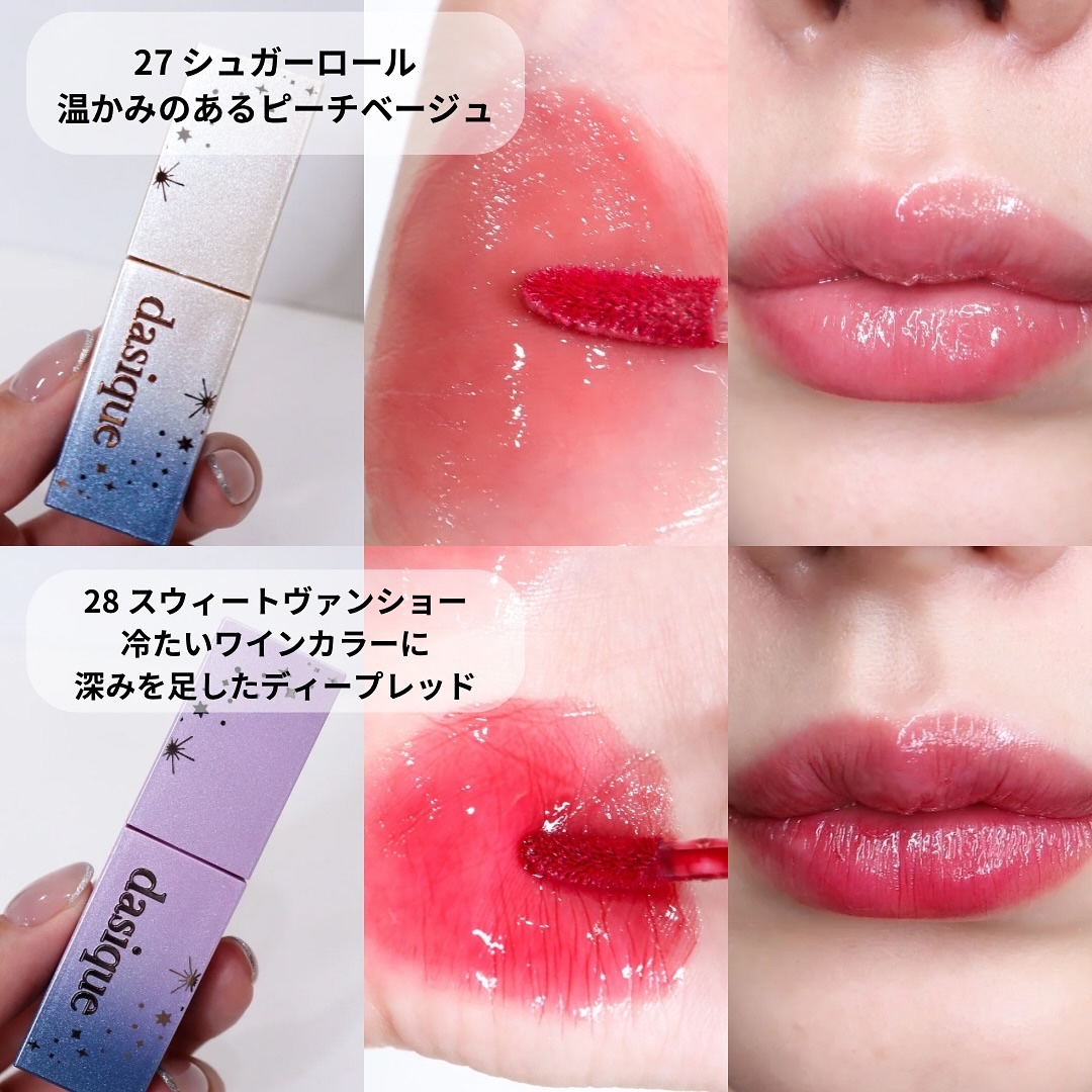 あめ玉のようなツヤ感と厚みのあるテクスチャー🍬 唇をナチュラルにぷっくり見せることができるヌーディーカラーの01〜03。 グロスのような透明感なのに、ティント効果もあっていいとこどりリップ🫶