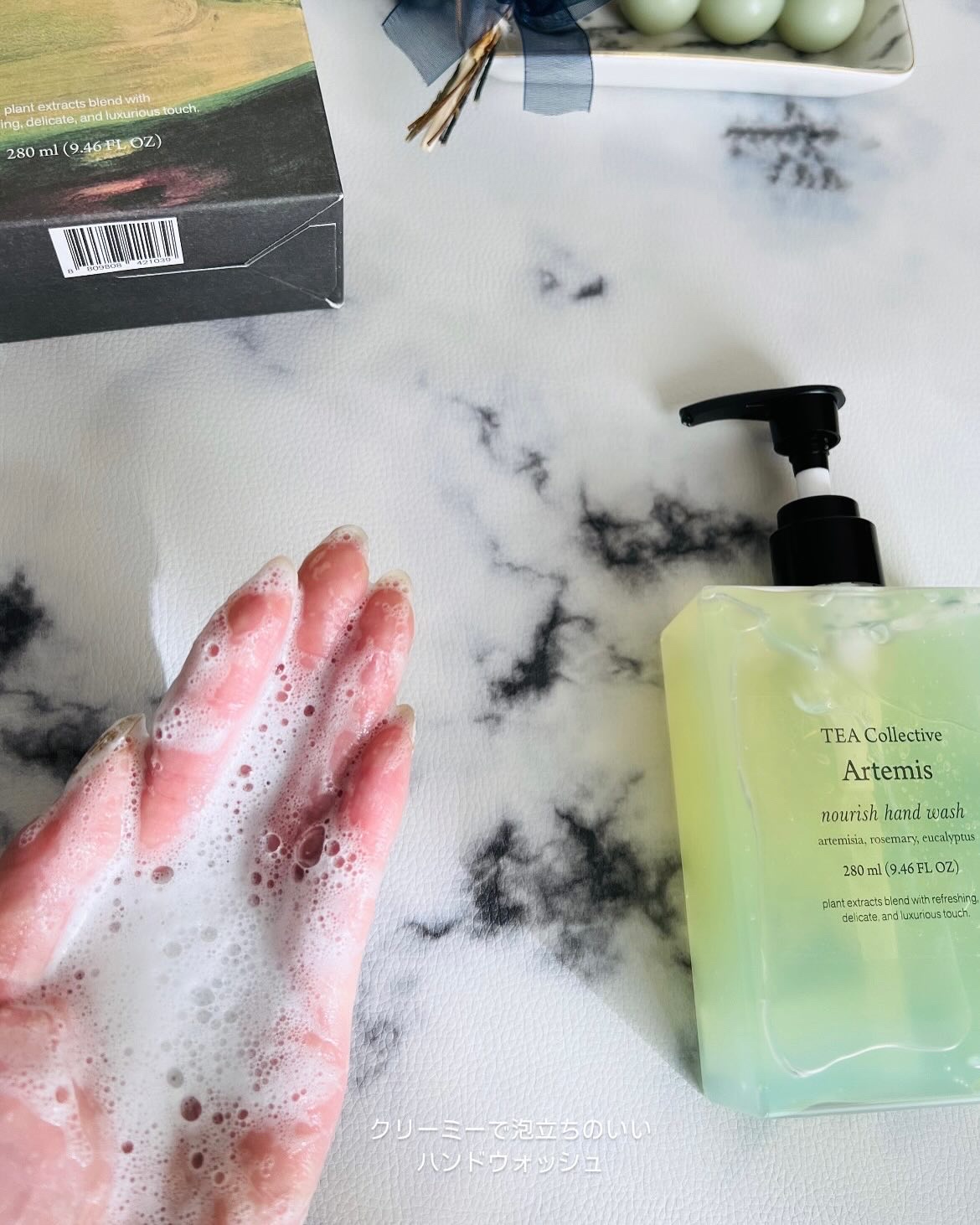 韓国茶のお茶をもとに作られたボディケアブランドで よもぎの香りが魅力的✨ ハンドウォッシュは、ジェルのようなもったりとしたテクスチャーで、なめらかな泡立ちで強すぎない香りが漂って、手洗い時間も楽しくなります😊 ハンドクリームは、こっくりとしたテクスチャーで、肌にピタッと密着するような使用感で、お肌をうるおいで包みこんでくれます。