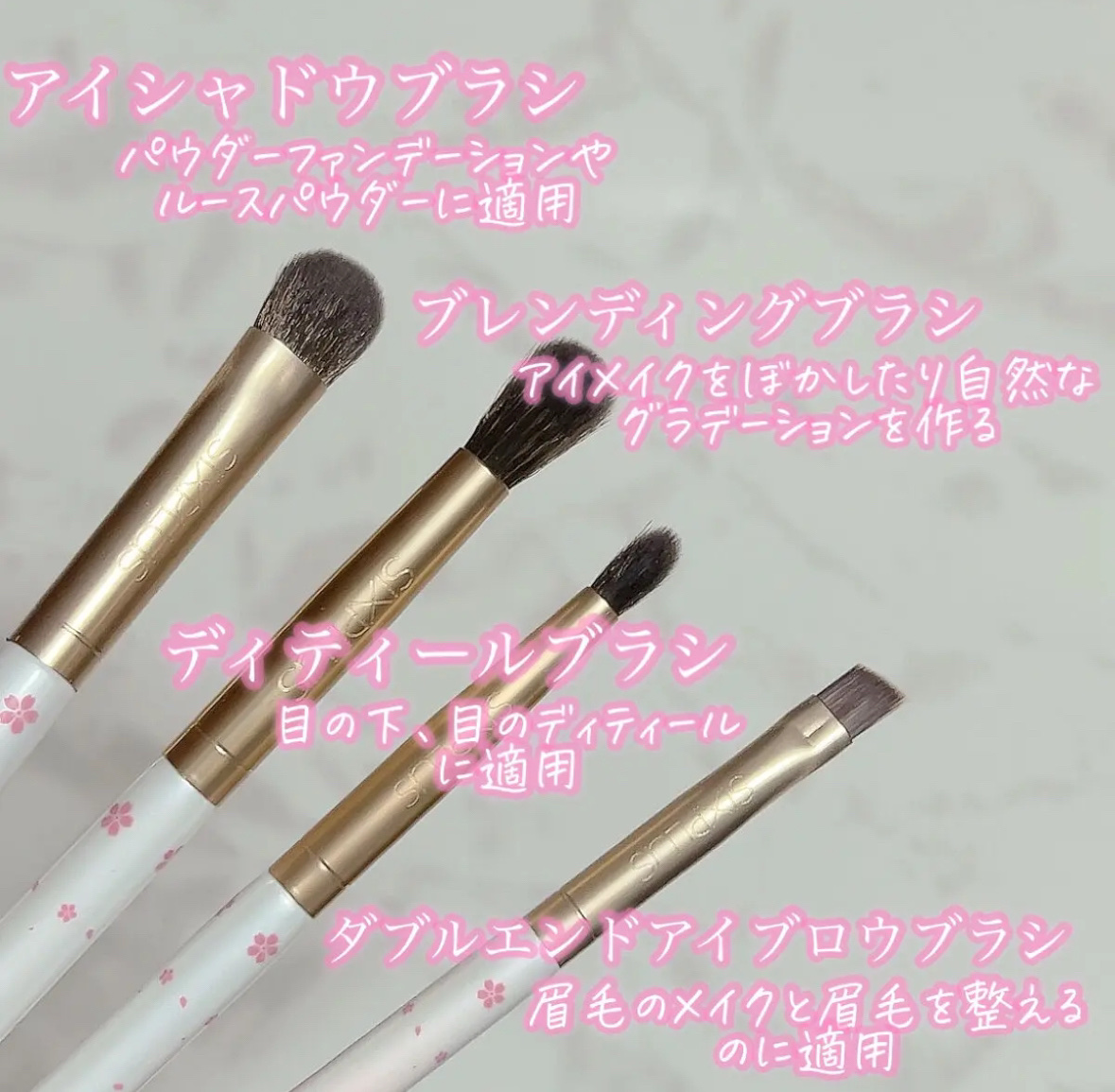 - 以前SIXPLUSの SAKURAシリーズのメイクブラシと異なり、桜の花びらがひらひらとブラシに舞い散ったようなデザインです。淡いピンクとホワイトのグラデーションカラーで落ち着き感のある可愛いメイクブラシにしました。 上質な木製柄を厳選し、なめらかな質感で、手触りも良く、握りやすい特徴がございます。また、指紋が付きにくい口管でブラシ全体の質感を高めてくれました。 たくさんのメイクブラシの中から厳選し、それぞれのメイクブラシの用途を最大限に生かせるようにデザインしました。
