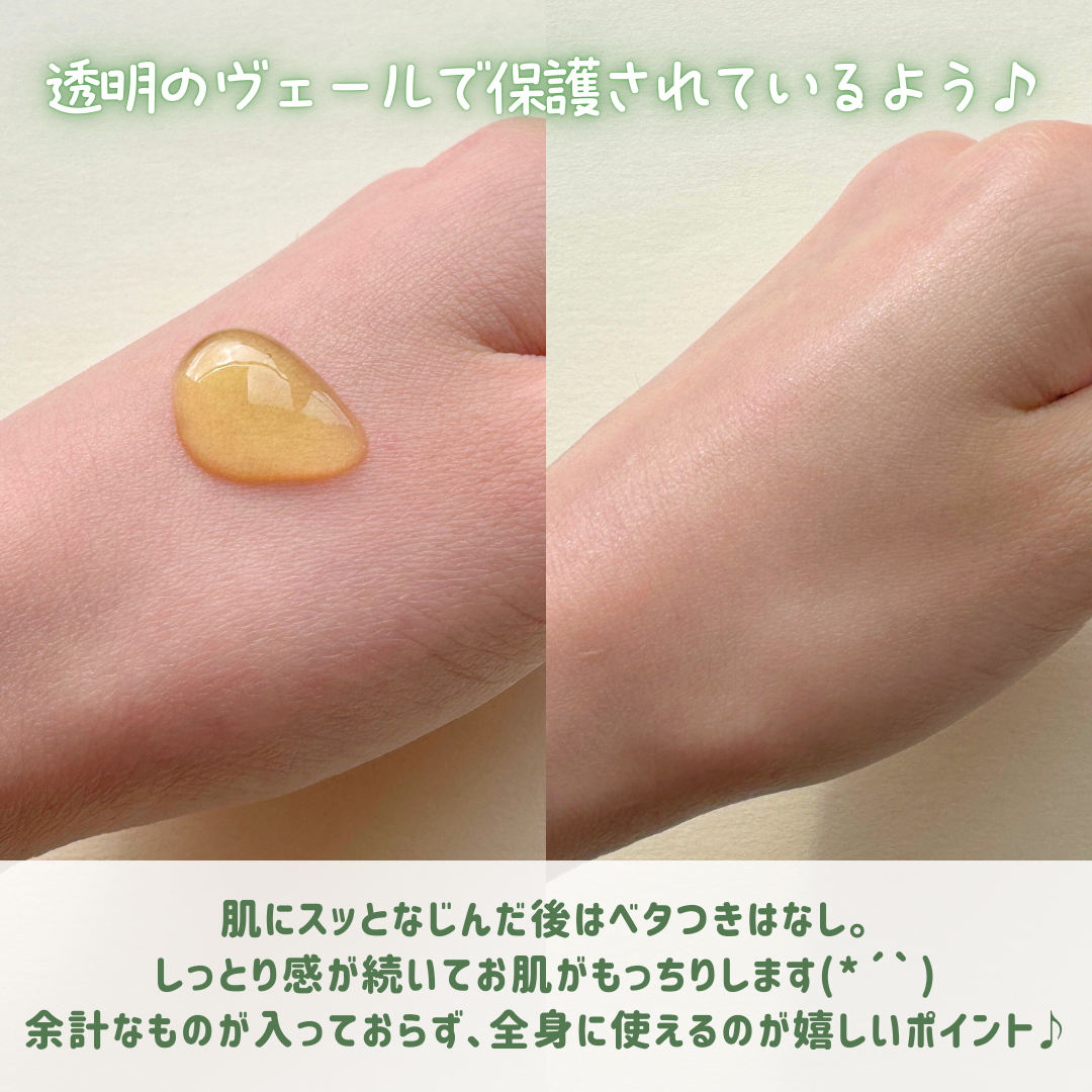 赤ちゃんから使える全身用美容液ということで、早速使ってみました🫧 こちら、無添加住宅メーカー様が無添加にこだわって開発した商品だそうです🏠✨ まず色味に驚き!黄色みのある…オリーブのような色味。あまりこういった色の美容液は見かけないので最初はびっくりしましたが、もちろん慣れました◎笑 テクスチャーがジュレ寄りの液で今までに無いトロトロ感。これはベタつく感じか…!?と思いきや、肌に乗せるとすーっと馴染みます◎