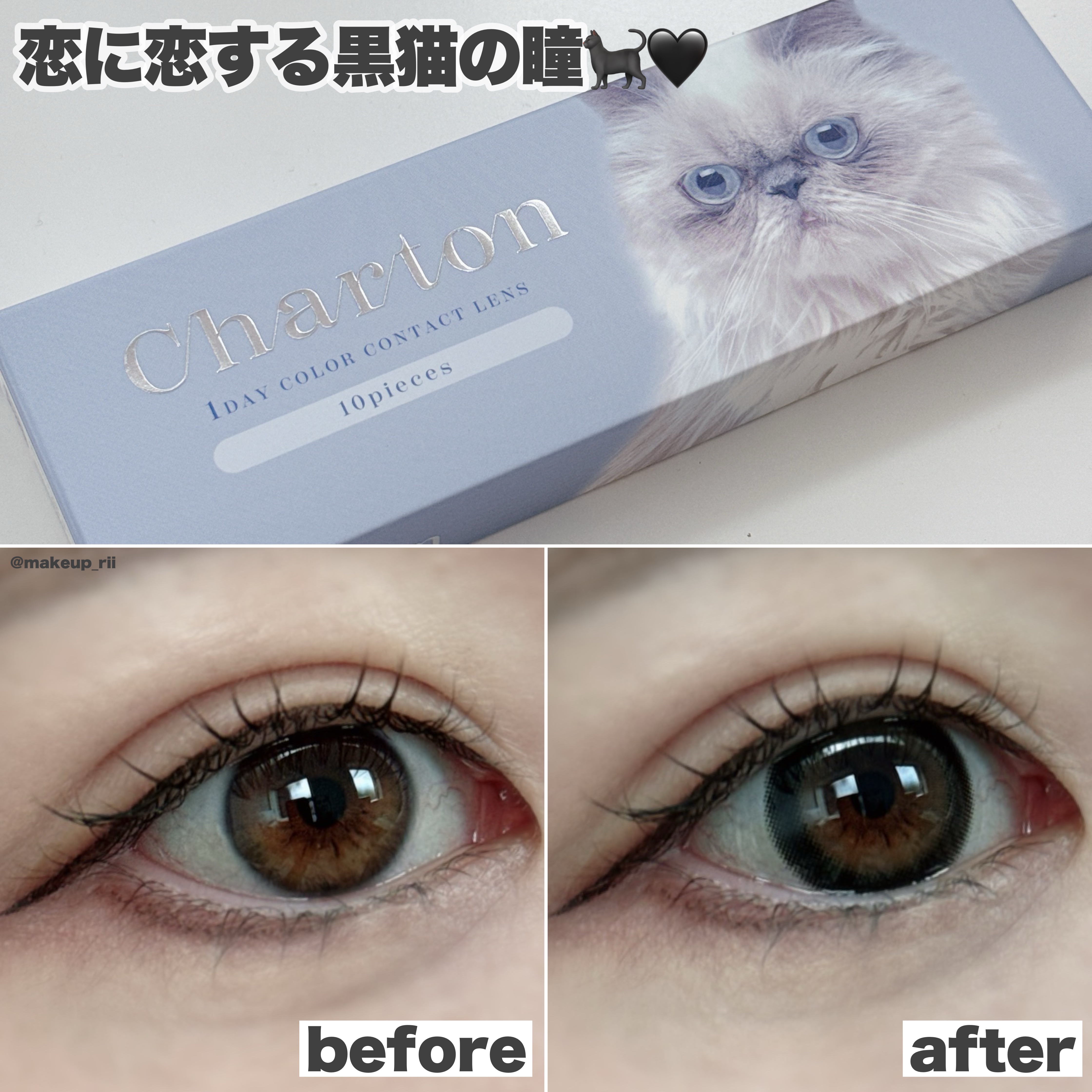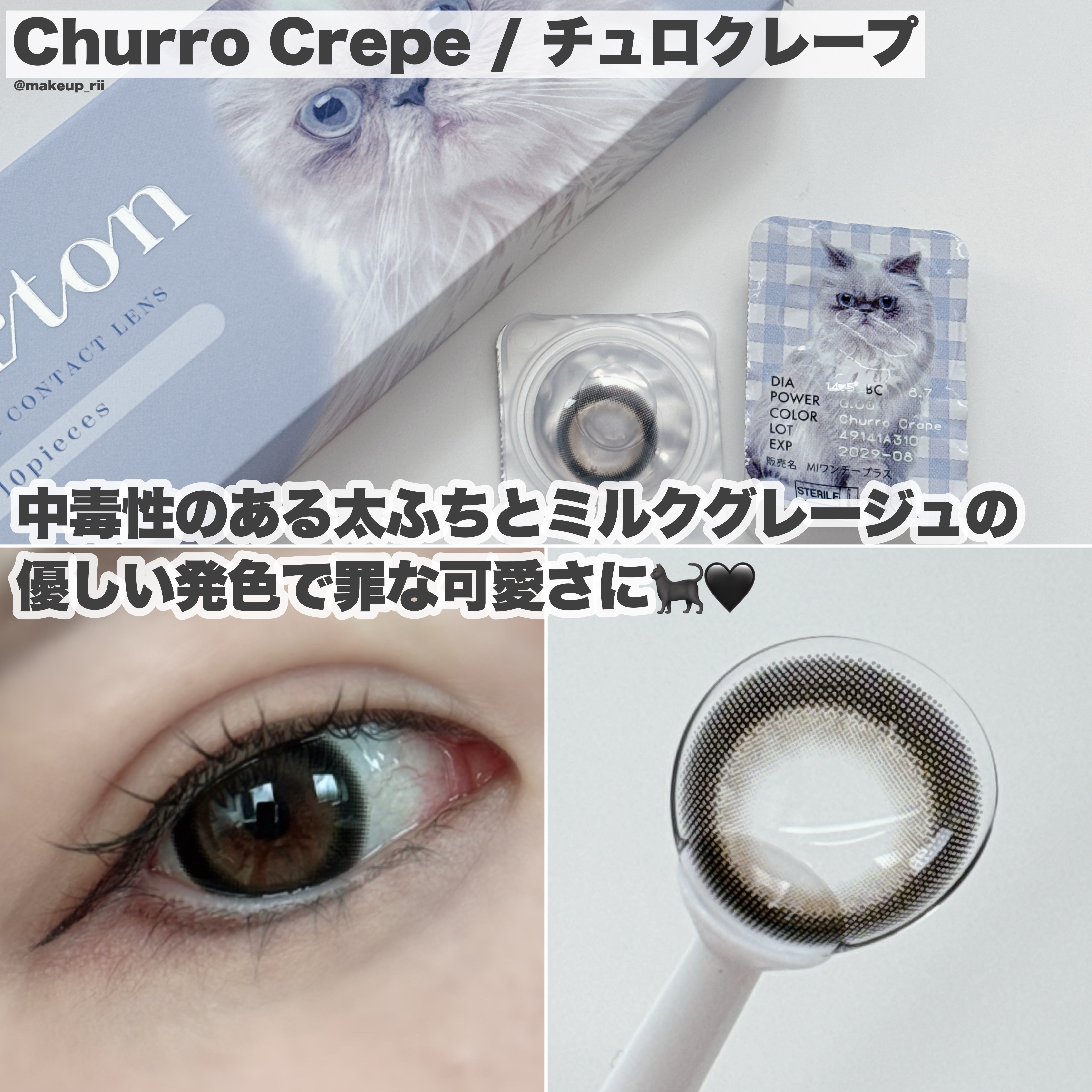 中毒性のある太フチとミルクグレージュの優しい発色で罪な可愛さに。 くっきり太フチがバブみ満載で、うるちゅるな瞳に沼っちゃうこと間違いなし💘 明るく見えるけど室内だと暗めで黒目がちに見えて、甘めのまんまるおめめであざと可愛い黒猫ちゃんみたい🐈⬛
