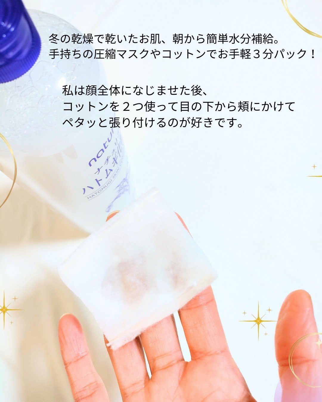 - 肌にうるおいを与えてスキンコンディションを整える、天然保湿成分ハトムギエキス配合の化粧水です。 みずみずしく浸透力に優れた処方なので、重ねるほどぐんぐん肌になじみ、角質層を水分で満たします。 たっぷり肌に重ねづけしてもべたつかないさっぱりした使用感なので、スキンケアのはじめにたっぷり使ってください。 肌がひんやりしてきたら十分に水分がなじんだサインです。 ■基本は化粧水として スキンケアのはじめにたっぷり使ってください。 500円玉大の量を3回重ねづけするのが目安です。 肌がひんやりしてきたら十分に水分がなじんだサインです。 ■ローションパックでさらにうるおい コットンやフェイスマスクにたっぷり含ませて約3分間パックすると、角質水分量がさらに高まります。 ■プレ化粧水として 洗顔後すぐにつけることで、その後につけるスキンケアのなじみをよくします。※角質層まで ■ボディにも べたつかないので、毎日の入浴後や日差しを浴びた後などのボディのスキンケアにもおすすめです。