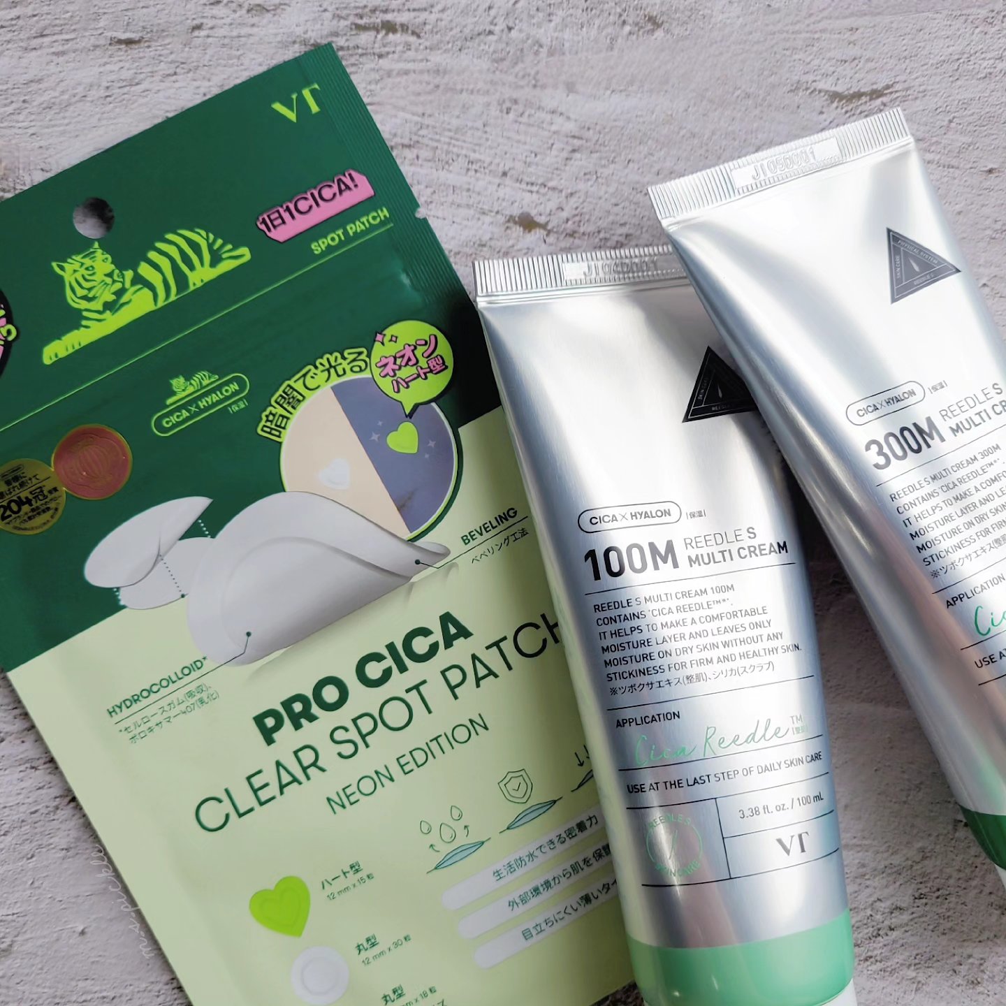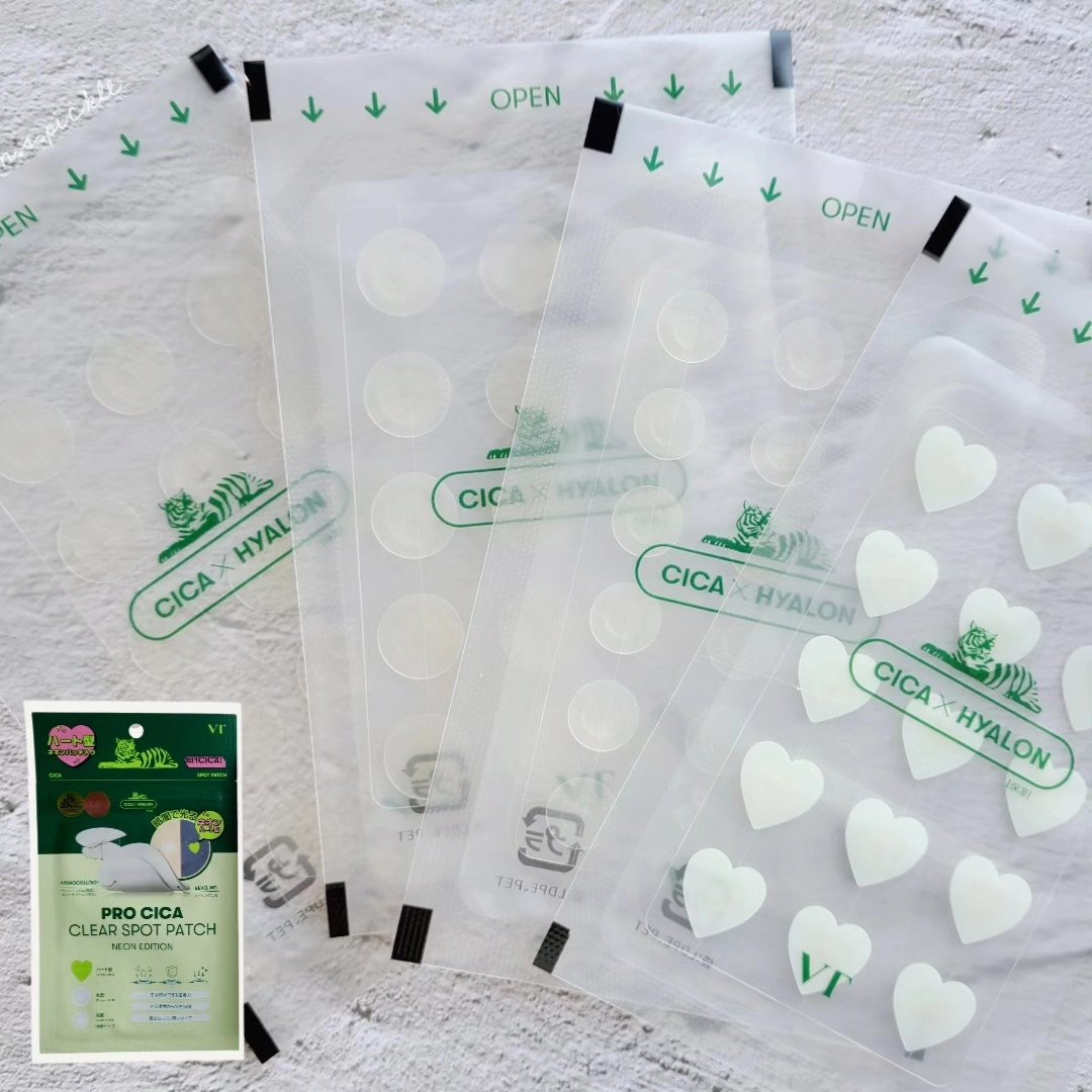 大人気VTのスポットパッチに可愛いネオンエディションが登場💚 大きめ、小さめ、ハート型の3種類が一袋にはいってるよ!このハート型が暗闇で蛍光に光るの✨ 朝晩毎日使えるマルチクリーム CICA REEDLE™︎*1+セラミド*2 配合 しっとり保湿ケアしながらなめらかなキメケアまで 100mlの大容量で、ボディにもマルチにつかえる!✨ どちらもベタベタしないので、いつでもどこでも塗りやすい💚