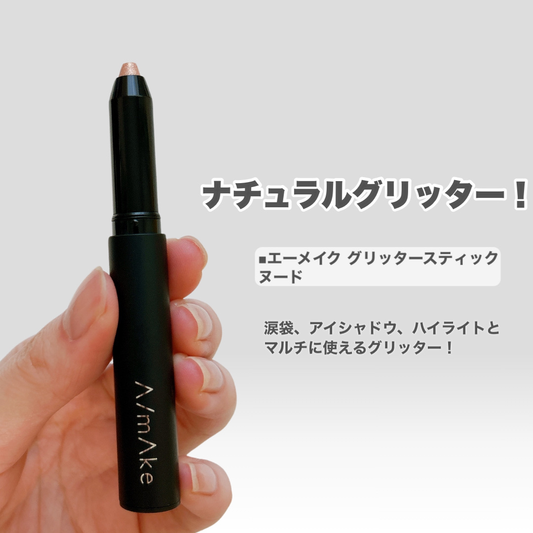 エーメイクは動画クリエイター「くれいじーまぐねっと」浅見めいさんプロデュースのコスメブランドだよ☺️ 速乾タイプだから瞼につきにくい◎ こすれにくくにじみに強いところもよかった 「ヌード」はベージュグリッターにホワイト&ピンクをMIXしたカラー 肌なじみがよく、ナチュラルな仕上がり!!