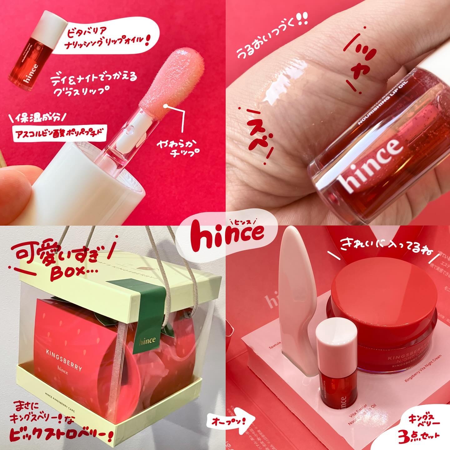あのツヤ肌メイクで有名なhinceからスキンケアアイテムが初登場🥹🍓 キングズベリーを贅沢に使用したアイテムを開発🧪! キングズベリー水を精製水の代わりに72%も🍓! ビタミンC誘導体やナイアシンアミド、パンテノールも配合で保湿、整肌成分もたっぷり入ってる🪞🪄 クリームはぷるっとジェリーテクスチャーでみずみずしく伸びがいい◎ 高保湿なのにベタつきが少なくて髪の毛の張りつきや、寝具の汚れも気にならない🛏️!