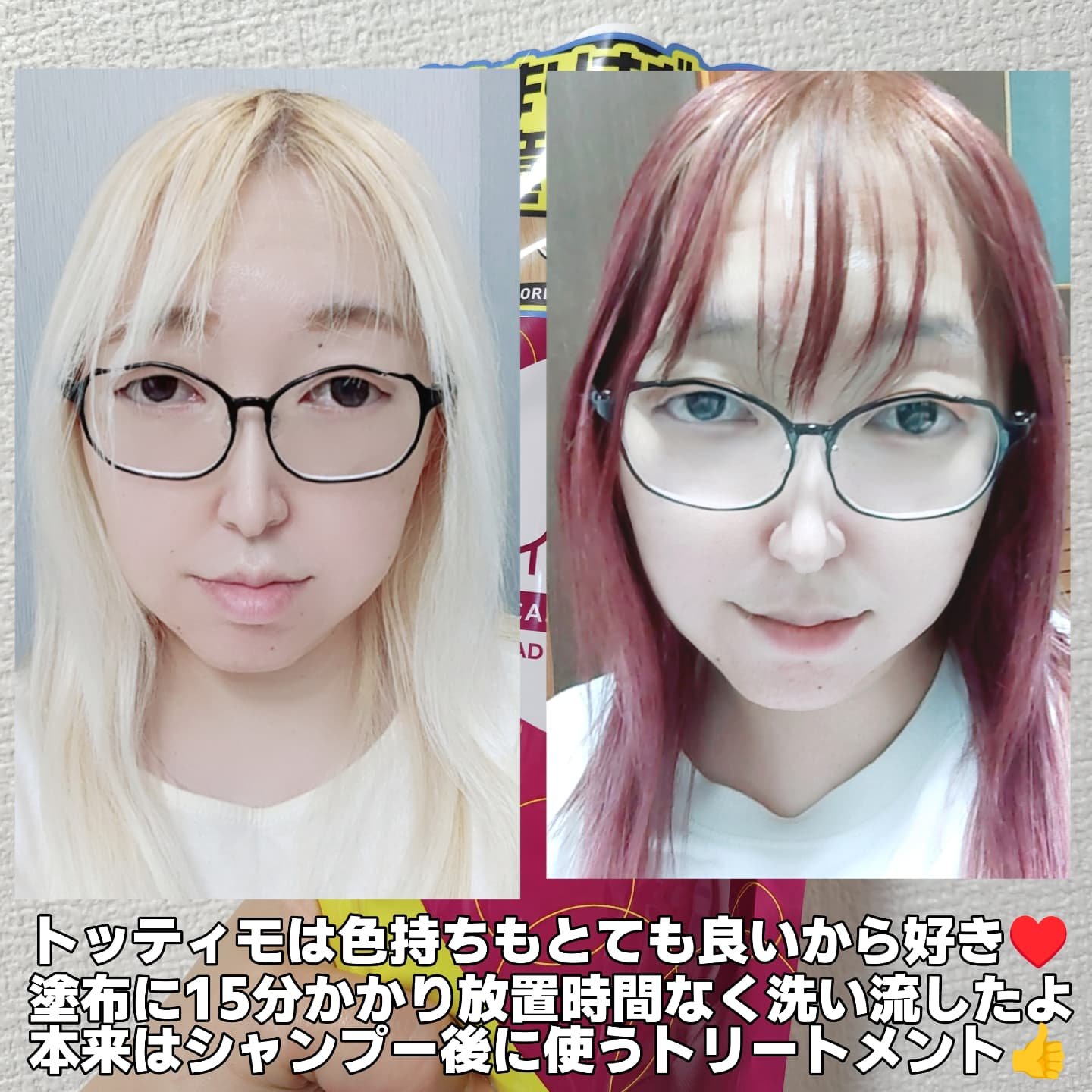 気軽にセルフカラーが楽しめるtottimo!ディップカラー。 簡単にいつものトリートメントを塗る感覚で使えました! 容量が多いため気にせずたっぷり使えるところが良かったです。 色はトーンが落ち、アッシュっぽくなりました🩶派手すぎず使いやすいカラーがお気に入りです!