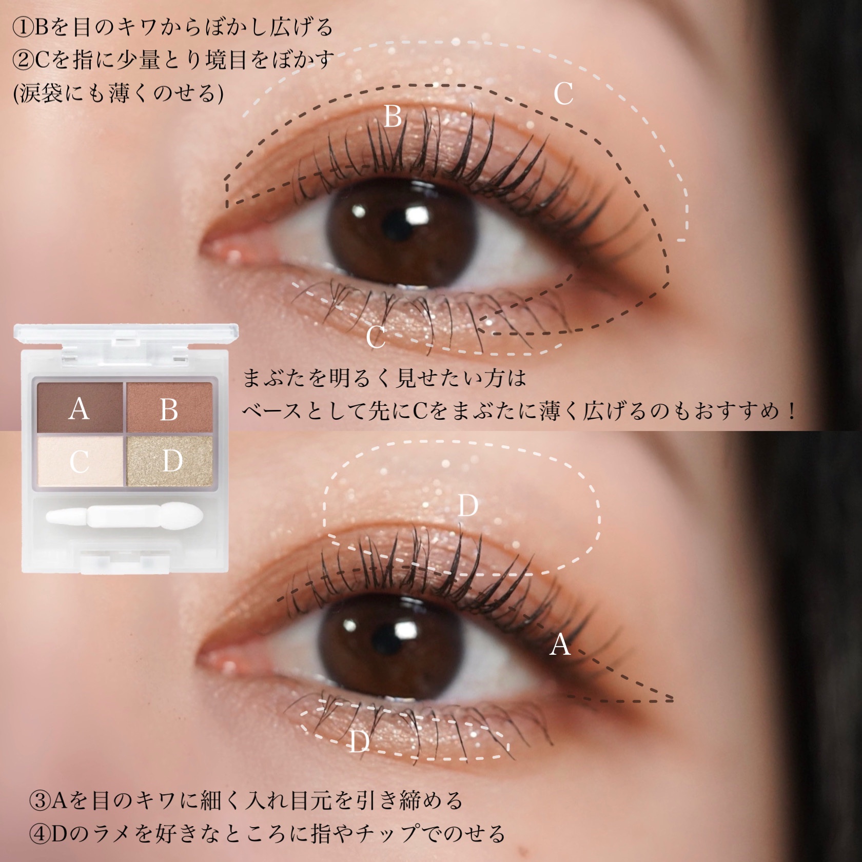 ベースメイクをパウダーファンデでなるべく薄めにしあげています。あまりにも粉っぽくベースを仕上げるとマットアイシャドウの付きが悪くなりそうな気がするので(なんとなく)…😅 パレット左上のベースカラーだけはアイシャドウブラシ(大)それ以外は(小)のブラシで塗っています! 涙袋の影は付属のブラシの細い方で。仕上げに涙袋に左上のベースカラーを少しのせると涙袋がふっくら見えてオススメです◎!