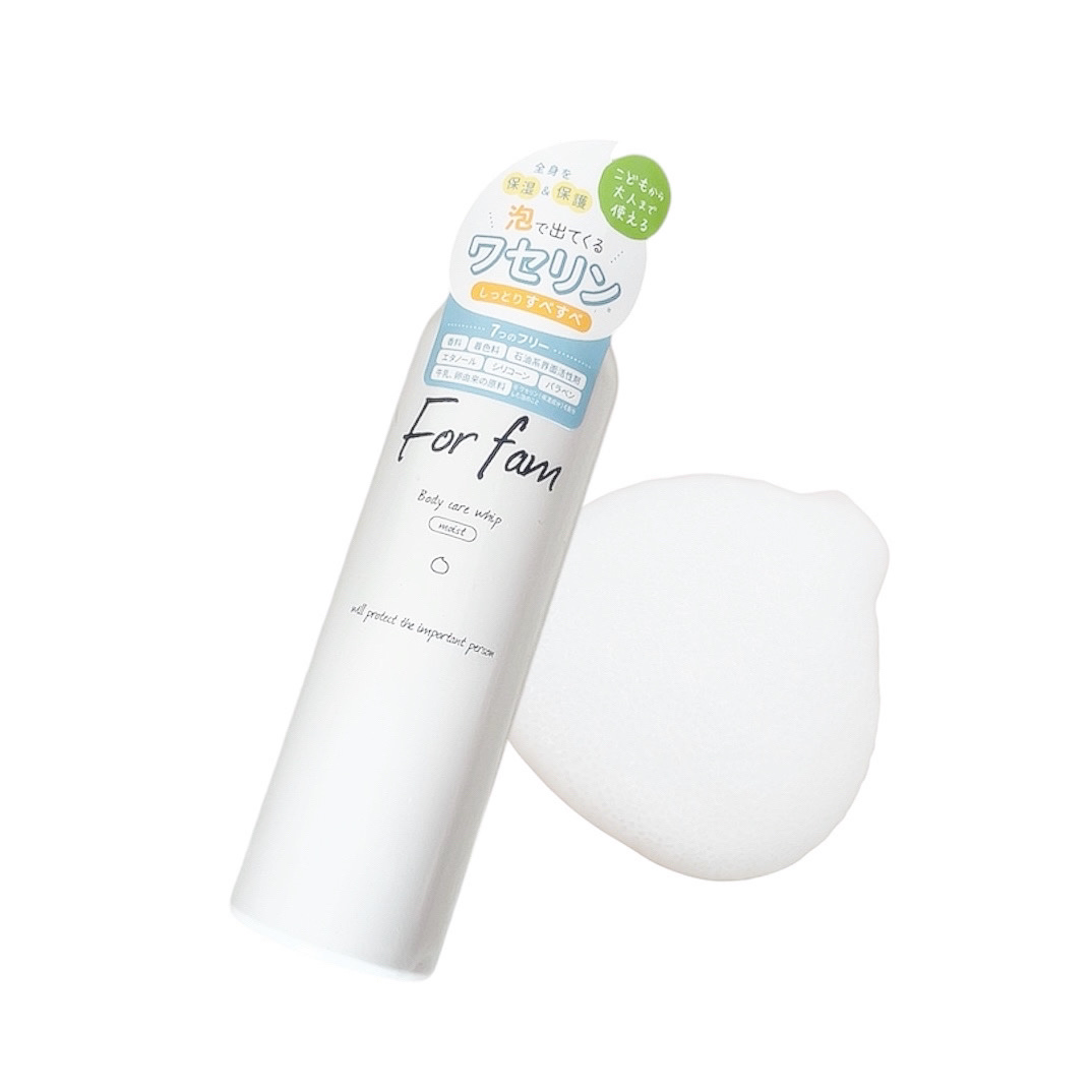 - もこもこ泡が優しい使い心地でお肌を守る、全身用保湿フォーム。 うるおいが長続きするワセリン配合のフォームタイプで、べたつきが少なく手軽に保湿ケアが叶います。 なめらかなぷるんと泡がお肌への摩擦による刺激や乾燥から守り、うるおいに満ちたすべすべ肌をキープ。 肌への配慮にこだわった7つのフリー処方*を採用しています。 For famは赤ちゃんから大人までみんなで使えるFamily cosmeブランド。 どんなお肌も大切にしたいから、低刺激な処方と厳選した保湿成分にこだわり毎日のケアに寄り添います。 *パラベン、香料、着色料、鉱物油、石油系界面活性剤、エタノール、シリコーン全て不使用