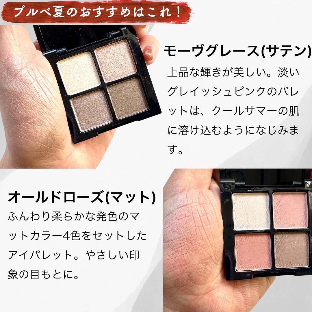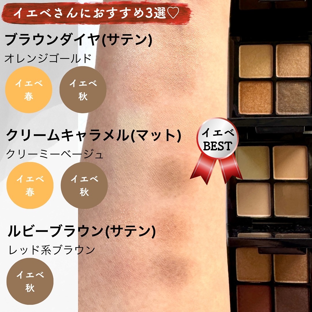 990円とは思えないくらい高発色で綺麗なツヤとマットです👏🏻 自分のパーソナルカラーに合わせて選べる質感とカラバリなので自分に似合うパレットに出会えるはず🤭🤍 ブラウンダイヤ(イエベ春・イエベ秋)サテン 上品さとかわいさを兼ね揃えたカラー モーヴグレース(ブルべ冬・ブルべ夏)サテン 透き通るような透明感を演出