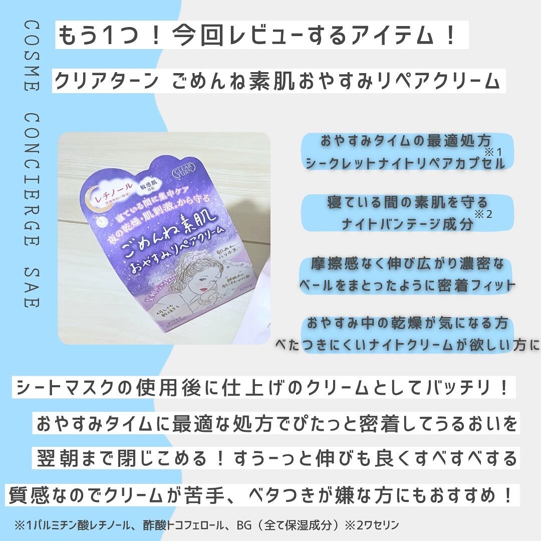 私の大好きなシートマスクの1つ!早くご紹介したかったアイテムです👏🥰 水分をしっかりつかんでうるおしてくれる保湿成分、ヒアルロン酸やシロキクラゲ多糖体が配合されているんです! おやすみ中に集中アプローチしてくれることを目指して設計されたクリームで、お肌を整えるレチノール誘導体などが配合!