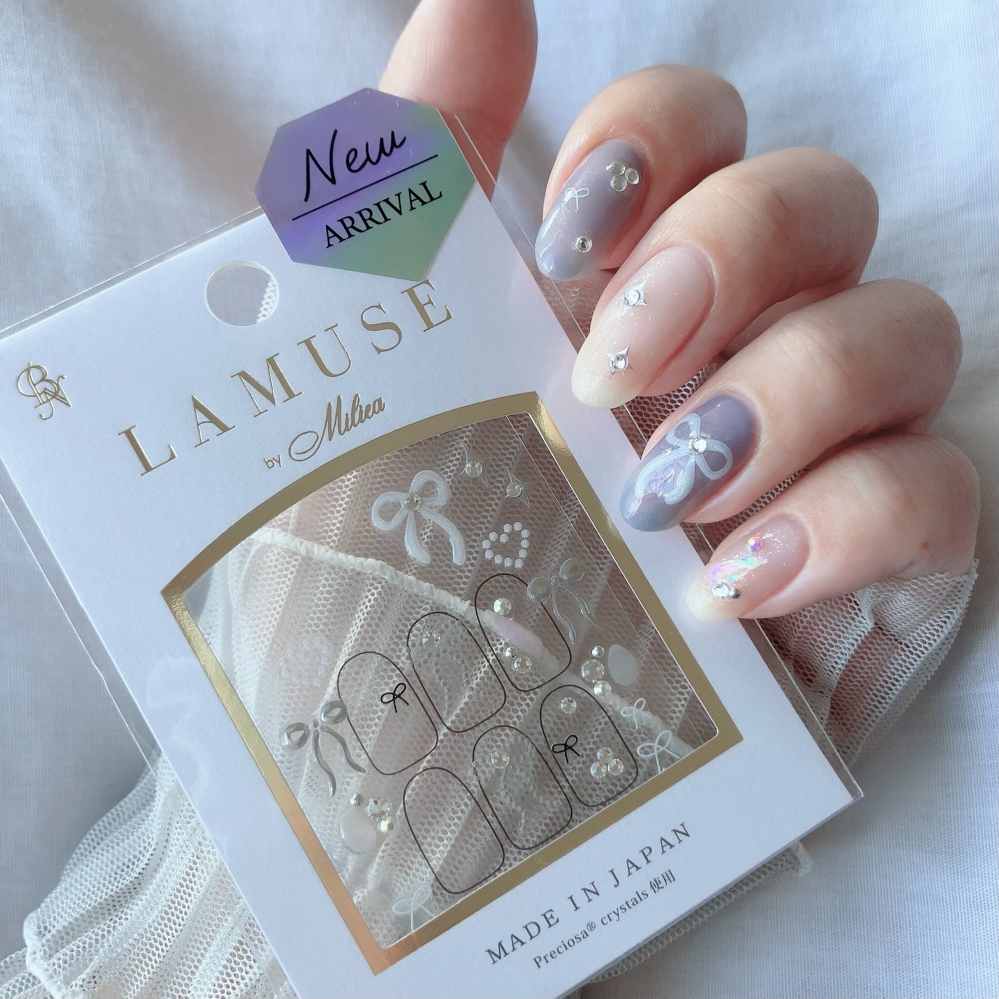 LAMUSEネイルシールは、配置見本あるし、デザイン困ったらそのまま貼ってもよし! シールのくっつきもよかった☺️✨ ストーンもキレイ、立体感もあったりでなによりデザインがかわいいっ💎✨ このネイルシールは楽天で購入可能✩