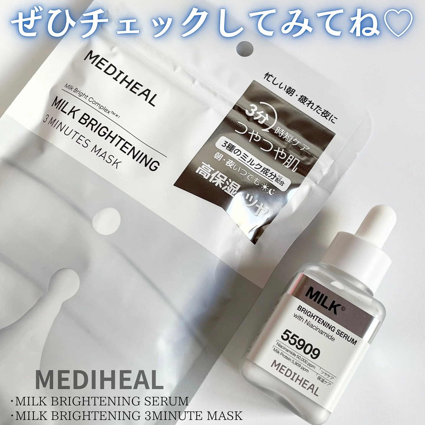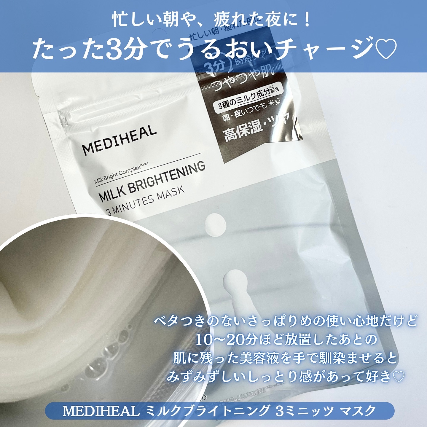 牛乳の栄養を含んだ優しいミルク成分が肌に浸透して艶やかで柔らかいキメの整った肌へ導いてくれるよ❣️ ナイアシンアミド、セラミドを配合した高保湿美容液💠 乾燥によるくすみやカサつきなどの肌悩みにアプローチ✨ 3種のミルク成分(保湿)やグルタチオン(整肌)配合のエッセンスをたっぷり含んだ柔らかシート🤍